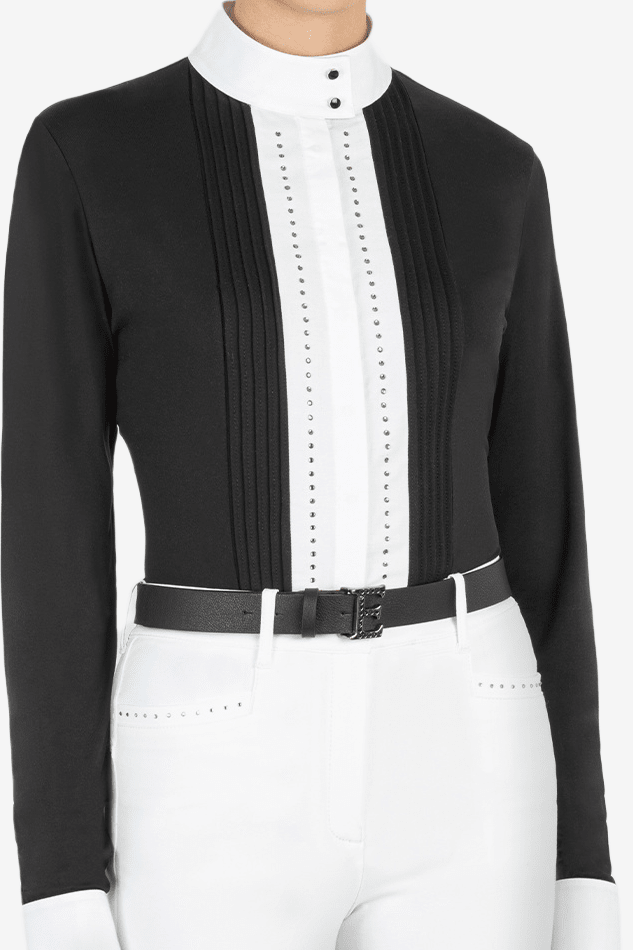 Langärmliges Turniershirt von Equiline mit Strassdetails auf beiden Seiten der Knopfleiste. Das Shirt verfügt über feine Ziernähte neben den Strasssteinen und einen stilvollen Kragenverschluss mit zwei schwarzen Knöpfen. Die gleichen Knöpfe befinden sich auch an den Manschetten. Hergestellt aus einem dünnen und leichten Material, das sehr angenehm zu tragen ist. Das Shirt ist bei 30 Grad waschbar.