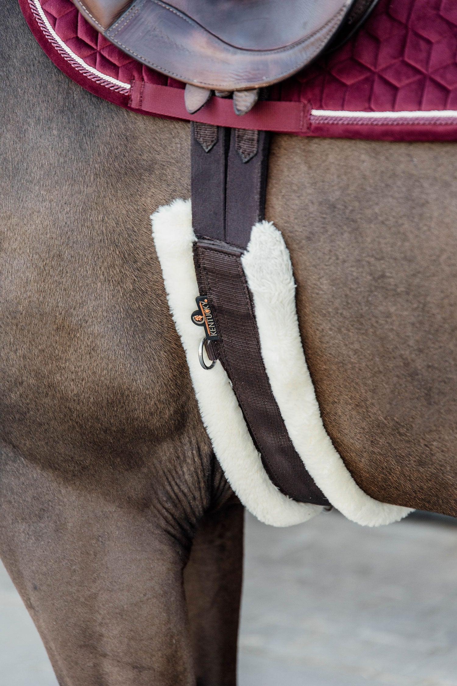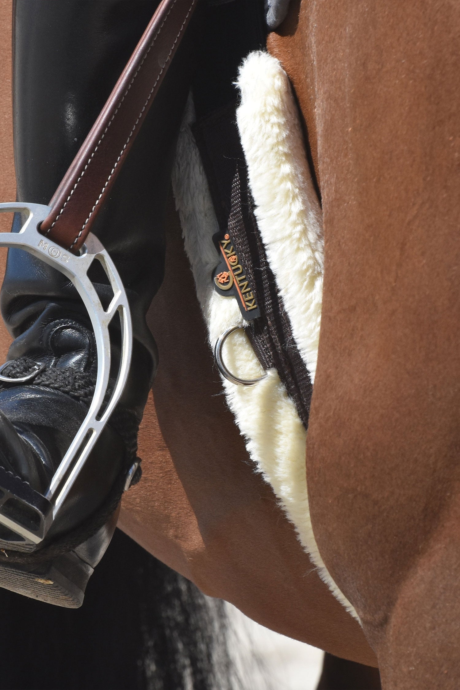 Der Lammfellgurt hat an beiden Enden Elastik, die den Druck gleichmäßig verteilen, sowie drei D-Ringe zum Befestigen verschiedener Hilfszügel. Die Elastiken sind sehr stark und bleiben stabil, da sie mit dreifachem Elastik vernäht sind. Wie alle anderen Produkte von Kentucky ist auch dieser Gurt dank des künstlichen Lammfellfutters 100 % tierfreundlich.