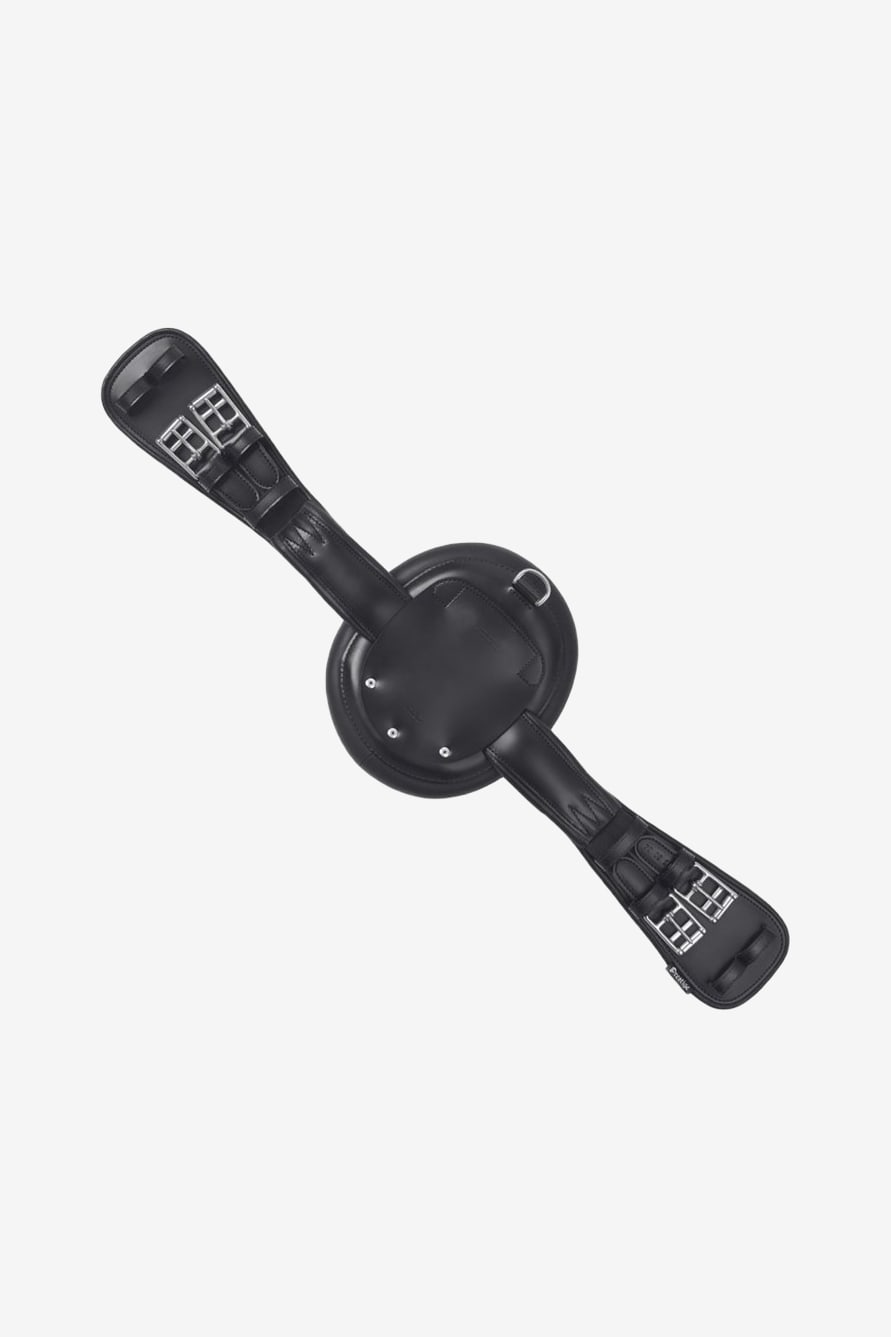 RP Dressur-Gurt mit Elastik von Prestige. Der 3A152 RP Dressur-Gurt besticht durch sein auffälliges Design und ist sowohl für Pferde als auch für Ponys geeignet. Der RP Gurt besteht aus zwei Teilen: einer runden Platte und einem speziell entwickelten Gurt, der frei durch die Platte gleitet. Der Vorteil ist, dass der Gurt frei durch die runde Platte gleiten kann, die dabei stabil bleibt und so verhindert, dass die Haut des Pferdes beim Bewegen des Gurtes gezogen wird. Der Druck des Gurtes wird dank der Platte auf eine größere Fläche verteilt, was den Komfort für das Pferd erhöht. Durch die runde Form und die drei inneren ovalen Einsätze aus besonders weichem Material wirkt die Platte wie ein Luftkissen, das den Druck zusätzlich reduziert. Die Schlaufen für den Gurt verbessern zudem die Passform.
