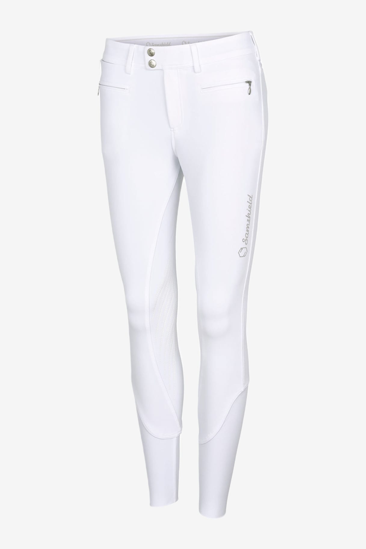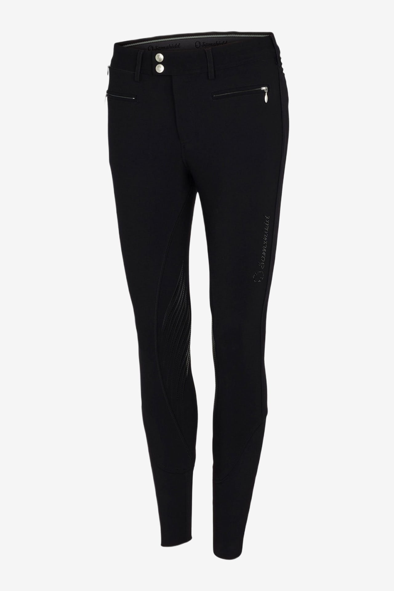 Auf der Innenseite des Bundes befindet sich ein Silikonband, das verhindert, dass das Shirt nach oben rutscht. Kniebesatz mit Silikongrip sorgt für hervorragenden Halt im Sattel. Am linken Oberschenkel befindet sich ein elegantes Samshield-Logo aus Swarovski-Kristallen, und die Gesäßtaschen sind mit Crystal Fabric Swarovski verziert, was das Gesamtbild abrundet.