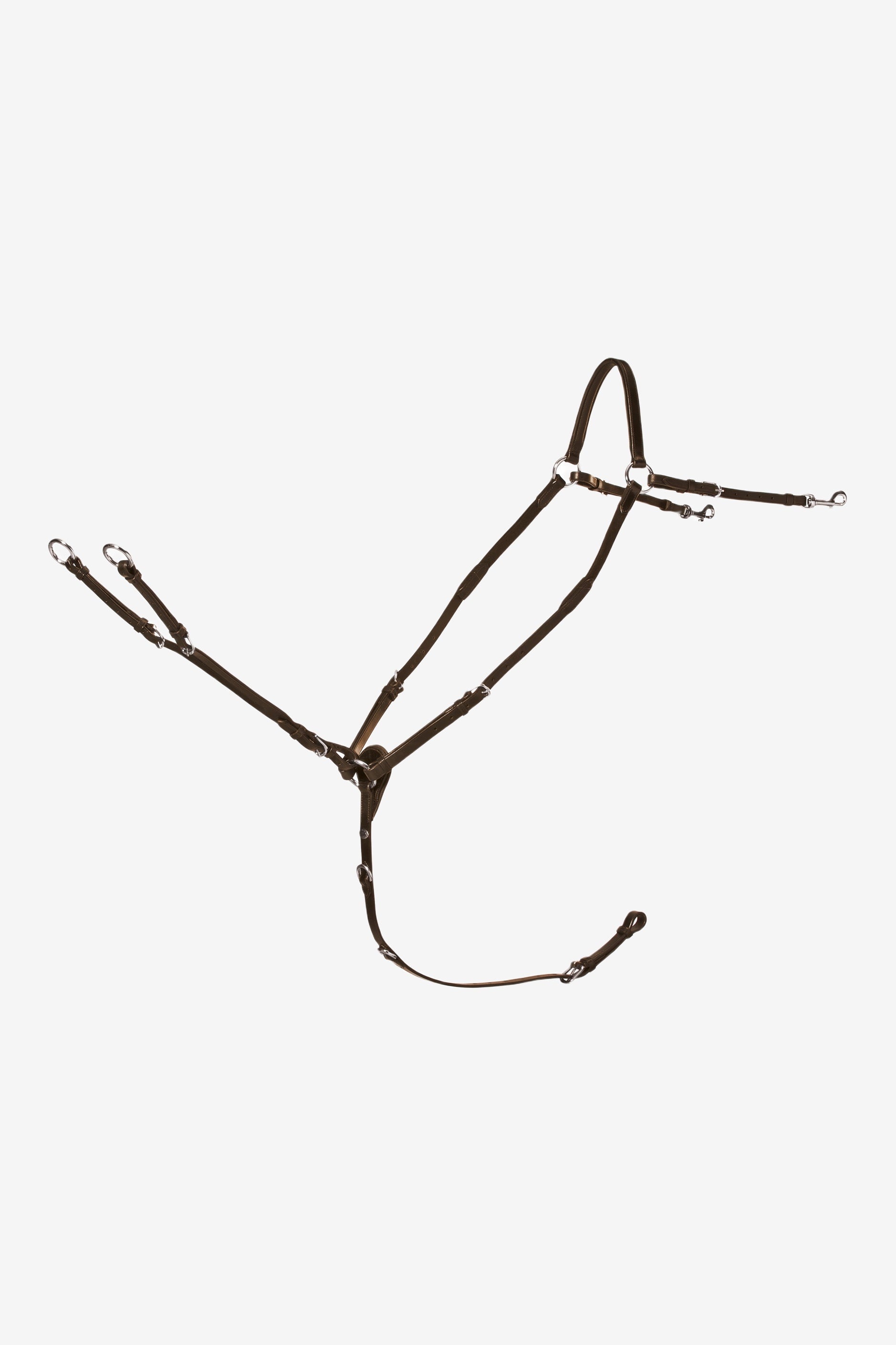 Ein elegantes und flexibles Vorderzeug aus hochwertigem Leder. Abnehmbarer Martingal mit verstellbarer Länge. Der elastische Einsatz an der Schulter macht das Vorderzeug noch flexibler.