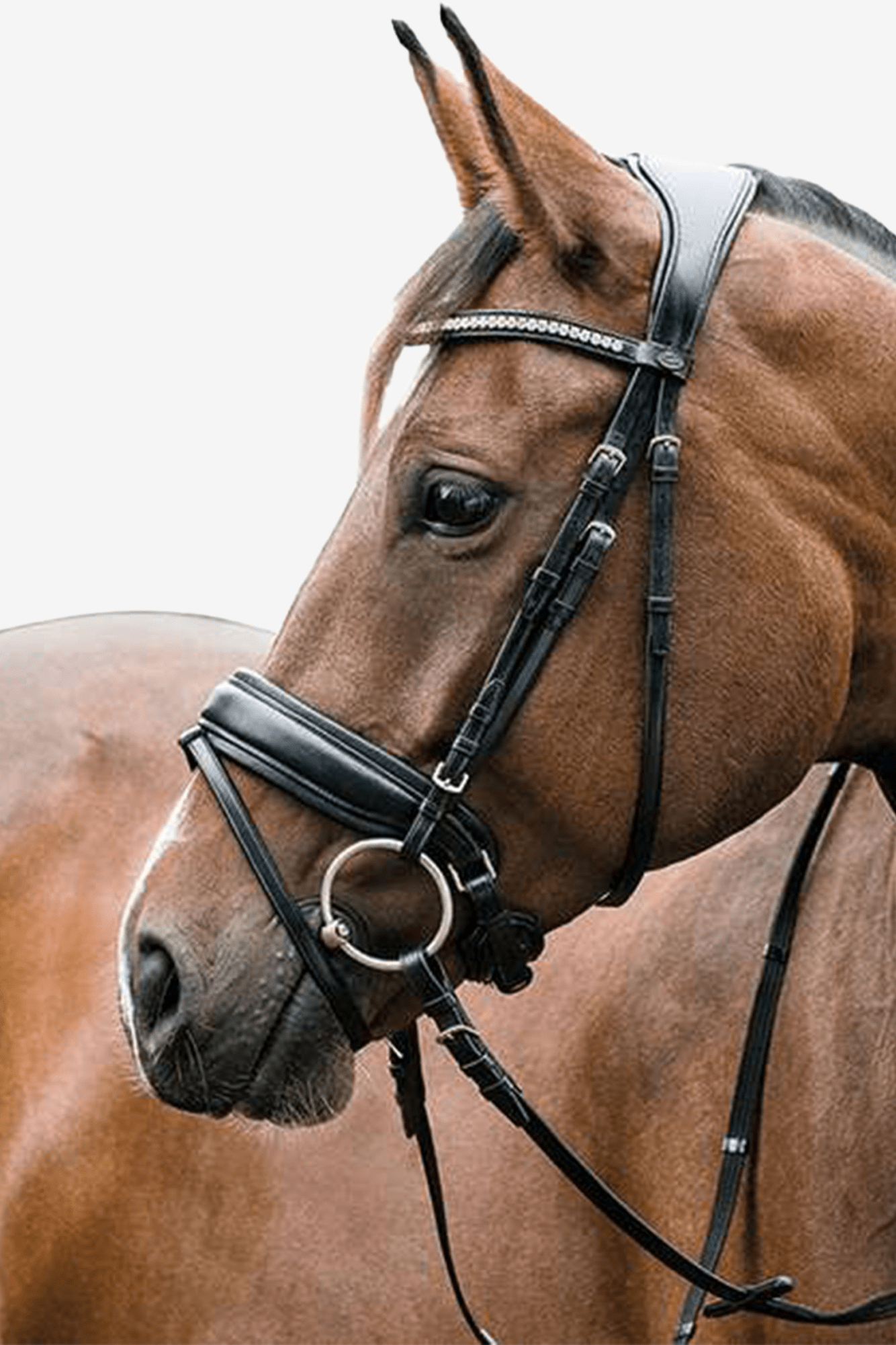 Ergonomiskt format träns från HorseGuard för bästa komfort hos hästen. Tränset är skönt vadderat över nacken för att undvika skav. Det har även ett vackert pannband med stenar och en extra bred nosgrimma som även den är vadderad. Tränset är tillverkat av engelskt vegetabiliskt garvat anilinläder.