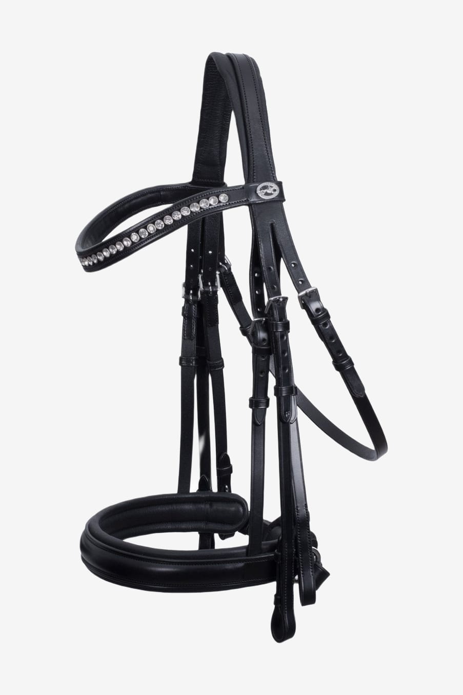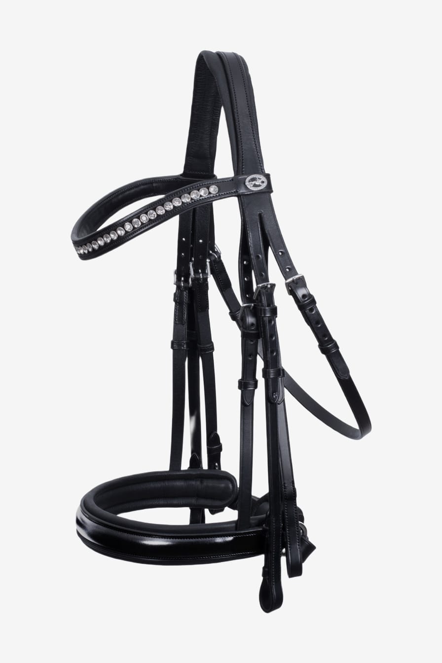 Eleganter Kandarenzaum mit breitem Nasenriemen, der 38 mm breit ist. Anatomisch geformtes Genickstück, das den Druck auf das Genick des Pferdes reduziert. Der Kehlriemen ist beidseitig verstellbar. Stirnband mit großen Kristallen und Logo auf dem Stirnband. Weiches und geschmeidiges Leder von hoher Qualität, das bei richtiger Pflege lange glänzend und schön bleibt.