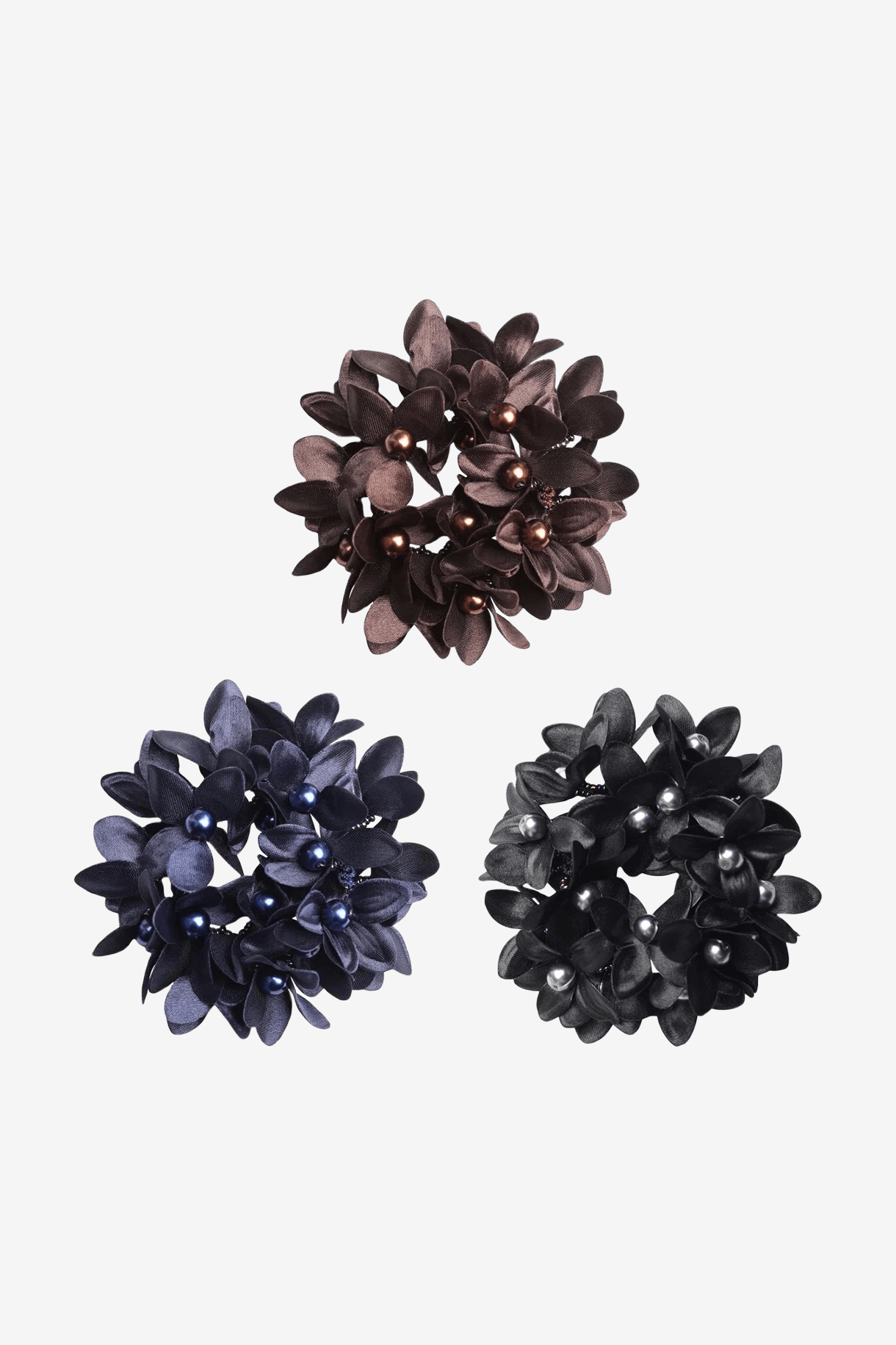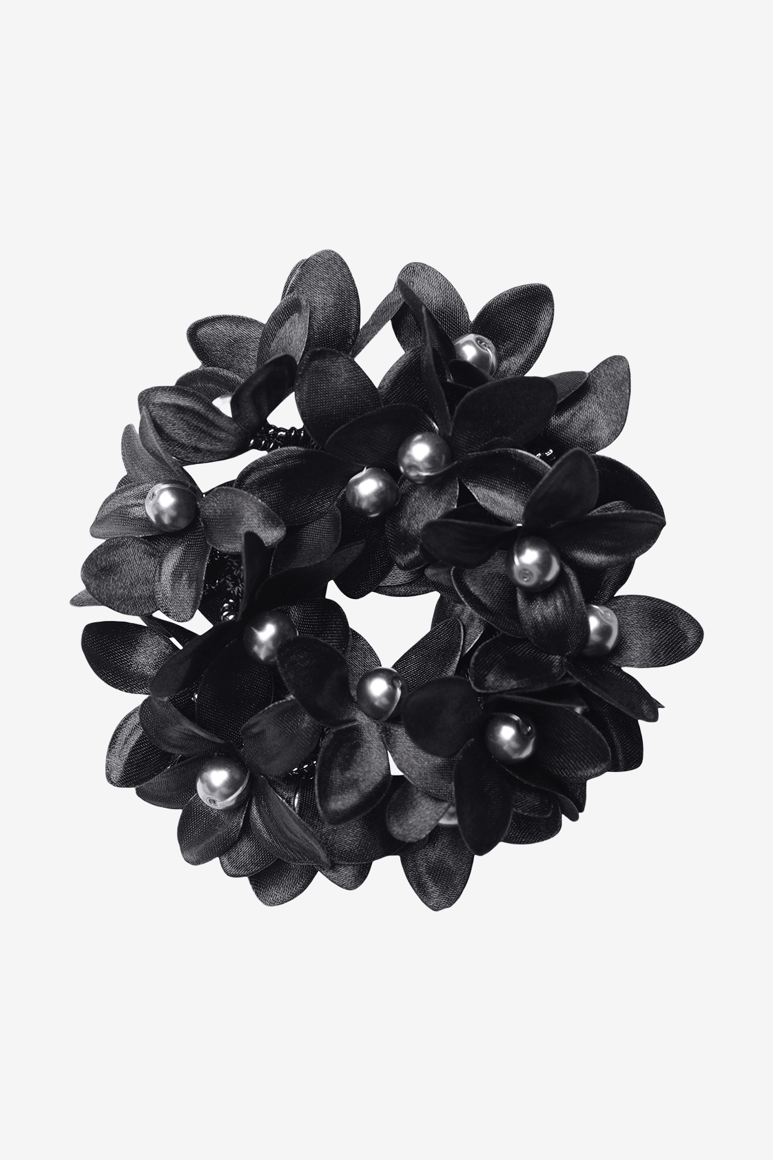 Smart scrunchie med perler og satinblomster.