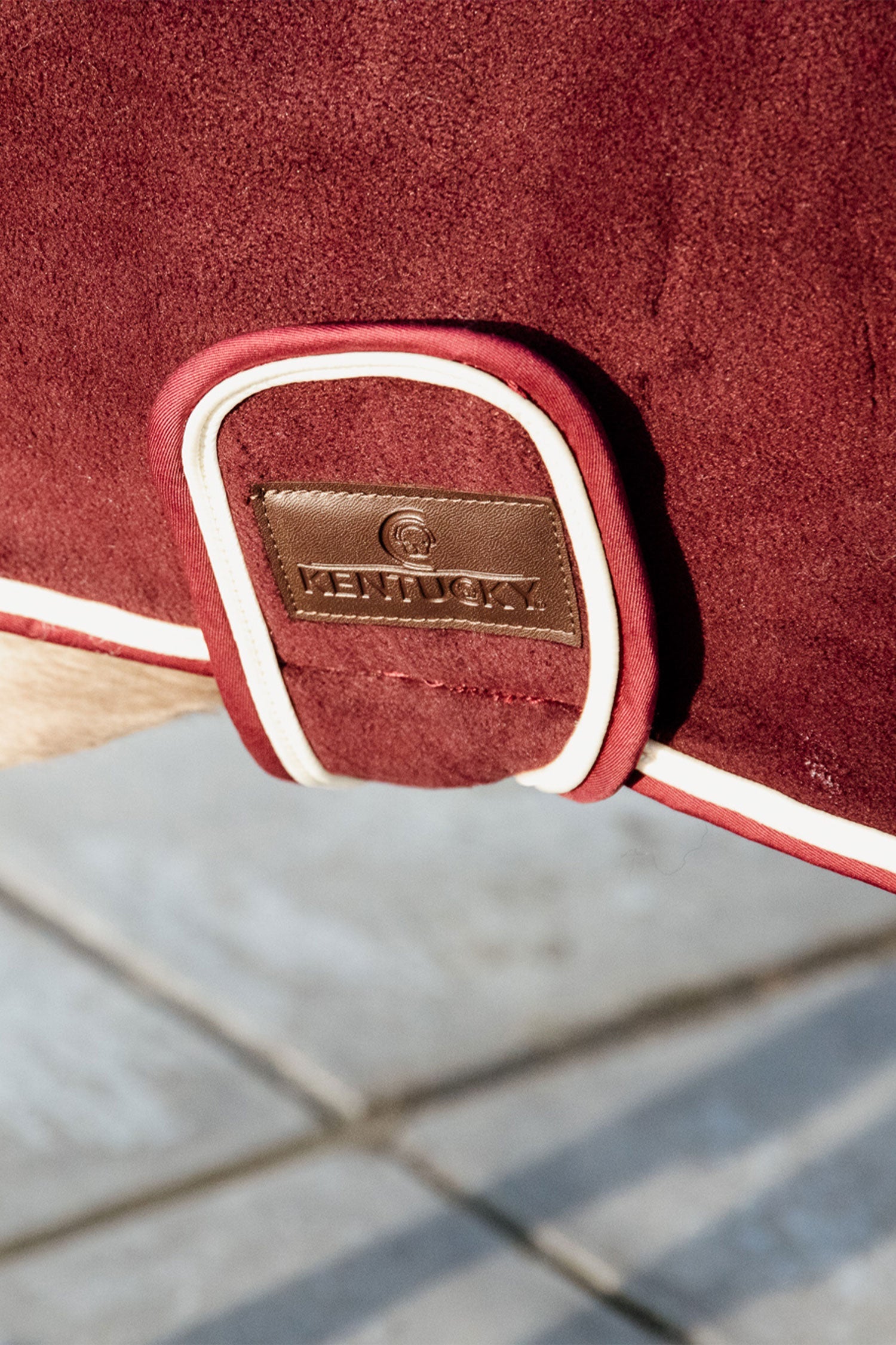 Syet med en flot kontrastfarvet paspolering. En mavegjord under hundens mave sikrer, at det sidder meget godt på plads. Lukkes med velcro foran, hvor der også sidder en flot læderlap med Kentuckys logo på.