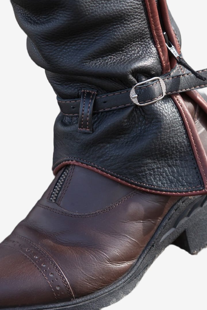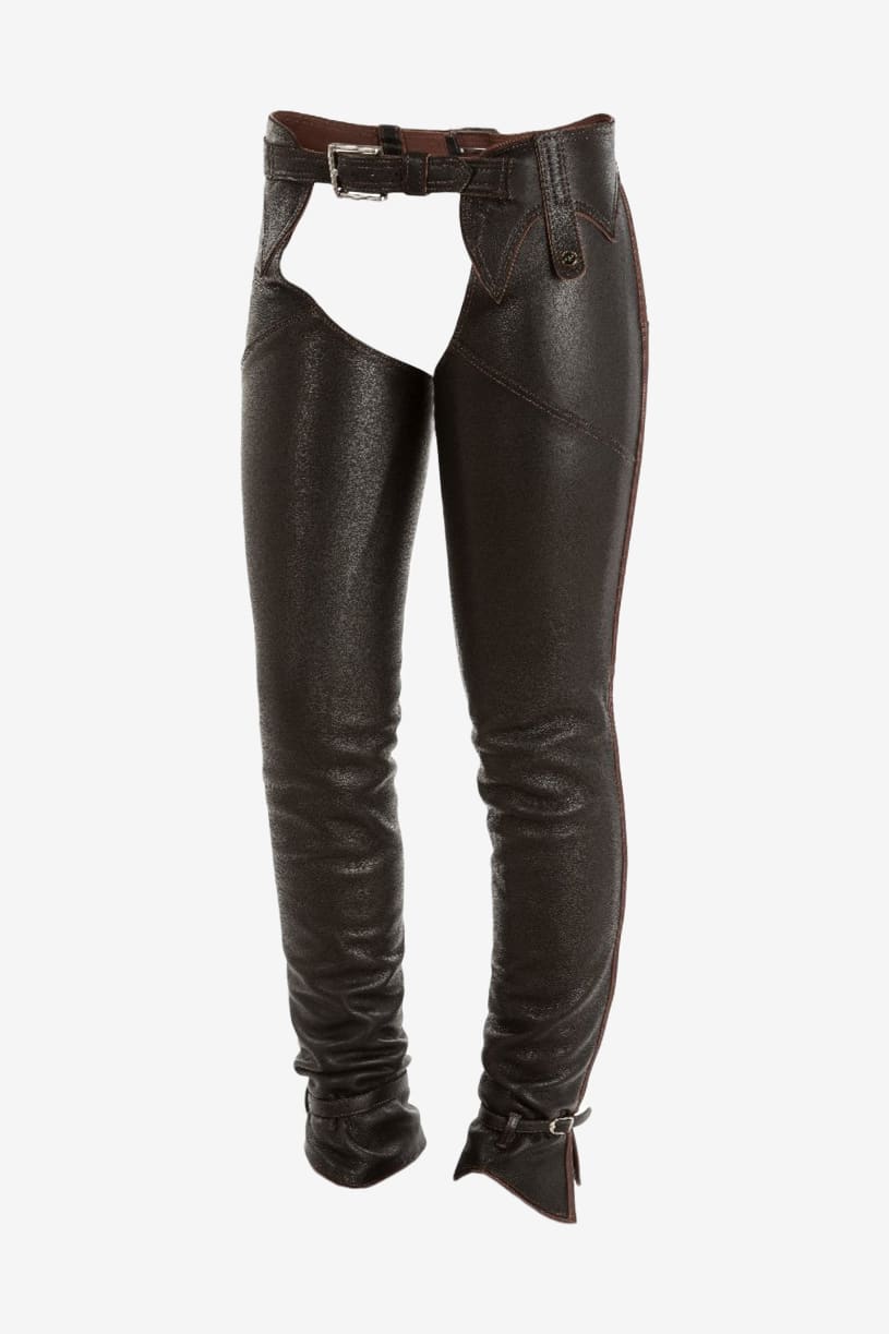 Stilfulde chaps i læder med en brun læderpiping på ydersiden, hvilket gør dem velegnede til både brune og sorte ridestøvler.