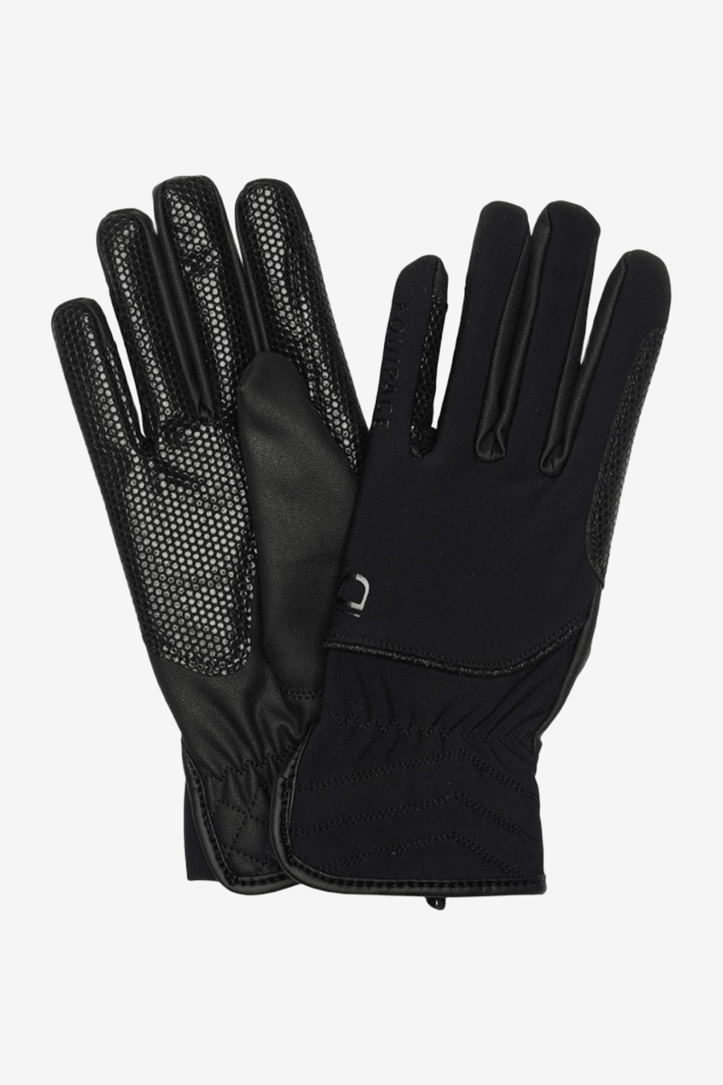 Elegant ridhandske från Equipage. Tillverkad i ett soft shell material med svart glitter dekor och silikon logo print i samma färg. Handsken har inslag av lycra material vid vristen för högsta komfort. PU läder vid handflatan och förstärkning vid tygelfattningen för extra bra grepp.