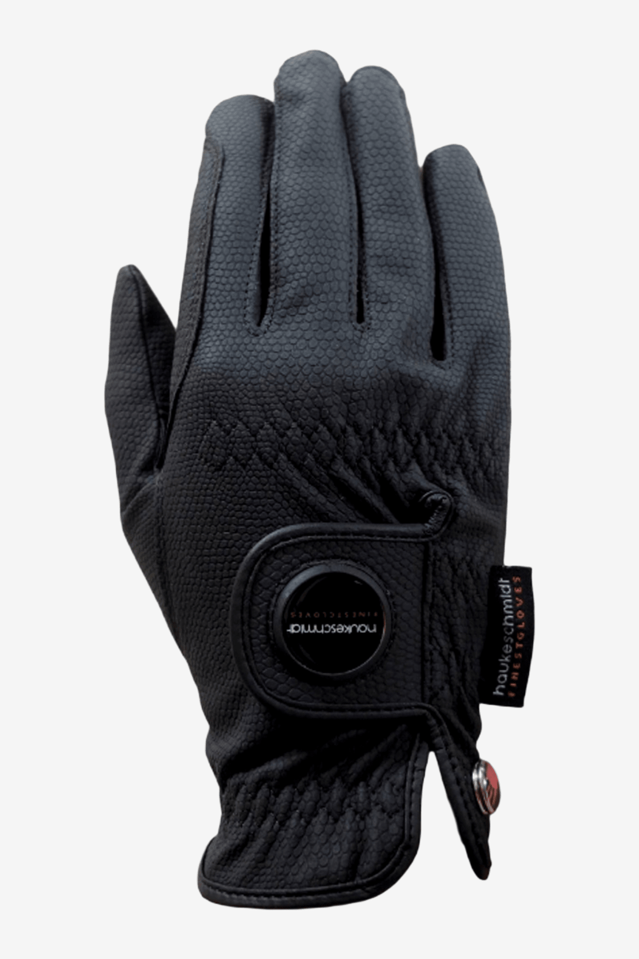 Fantastisk ridhandske från Hauke Schmidt i bra kvalitet. Handsken är tunn vilket ger en oöverträffad känsla i tyglarna till hästens mun. Den har bra grepp och en skön nära passform med förstärkningar vid tygelområdet. Handsken har resår på ovansidan av handryggen som anpassar sig efter varje hand. Den andas och är väldigt hållbar. Handsken stängs med ett smidigt kardborrespänne och har en snygg Hauke Schmidt-logotyp.