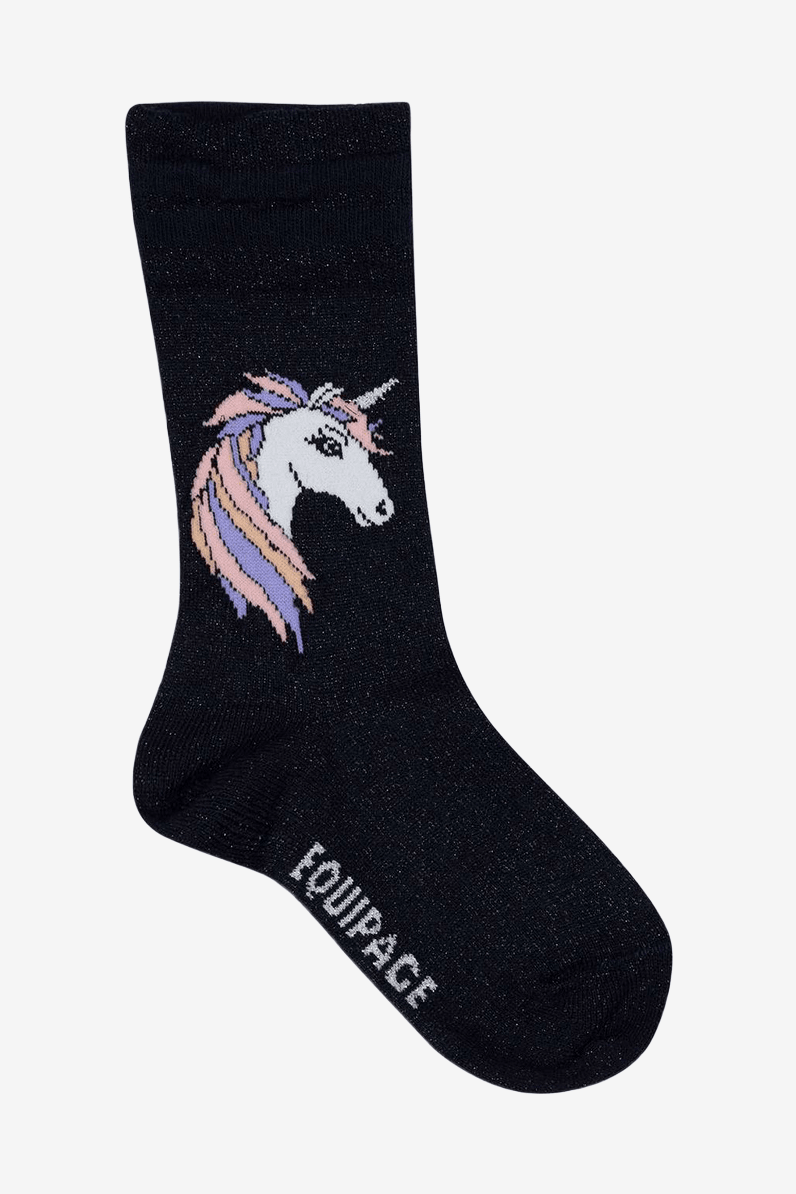 Børneridestrømper med glitter-look. Formet tå for bedste komfort og stræk i enden af skaftet med sporty striber. Dekoreret med en sød enhjørning i regnbuefarver. Lavet i en blød og behagelig bomuld, polyamid og elastan blanding.