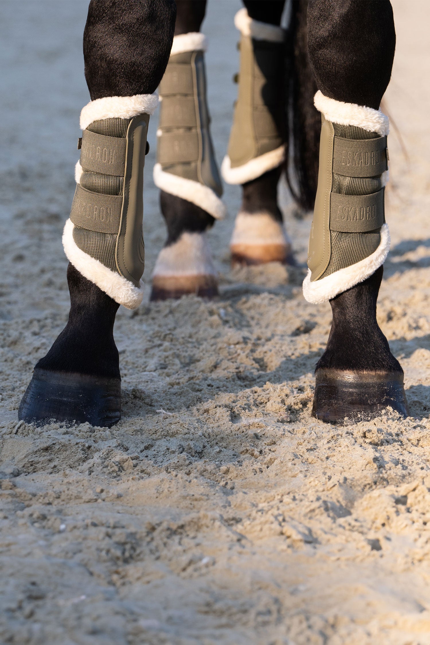 Benbeskyttere fra Eskadron Classic Sports SS25 med yderside af læderimitation og blød kant af dejlig kunstpels. Forstærket inderside for at beskytte mod slag. Kraftige velcrolukninger med elasticitet og logo på den øverste velcrostrop.