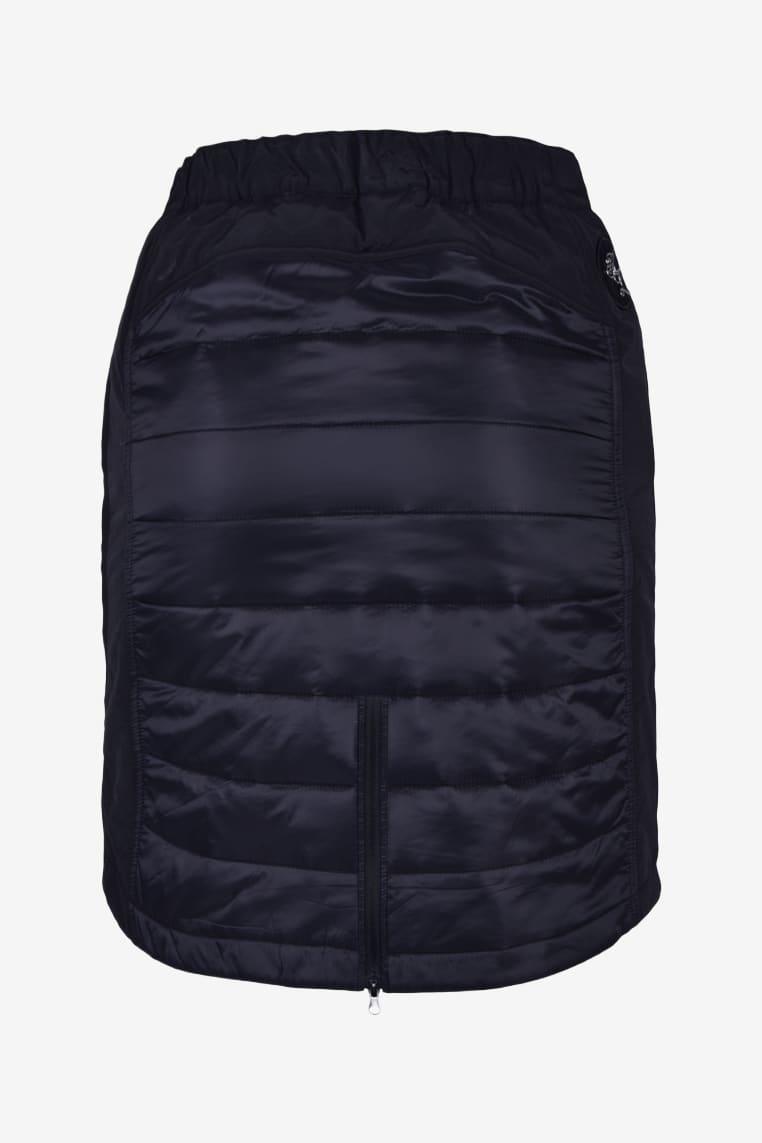 Ridekjole med foret paneler i let og smidigt materiale. Elastisk bånd i taljen samt kort lynlås foran og bagpå, så den nemt kan åbnes under ridning. Metalpatch med fløjsdetaljer på højre side. Perfekt til at tage kjolen udenpå ridebukserne på en kold dag i stalden, både for at holde ridebukserne rene og for at holde bedre på varmen.