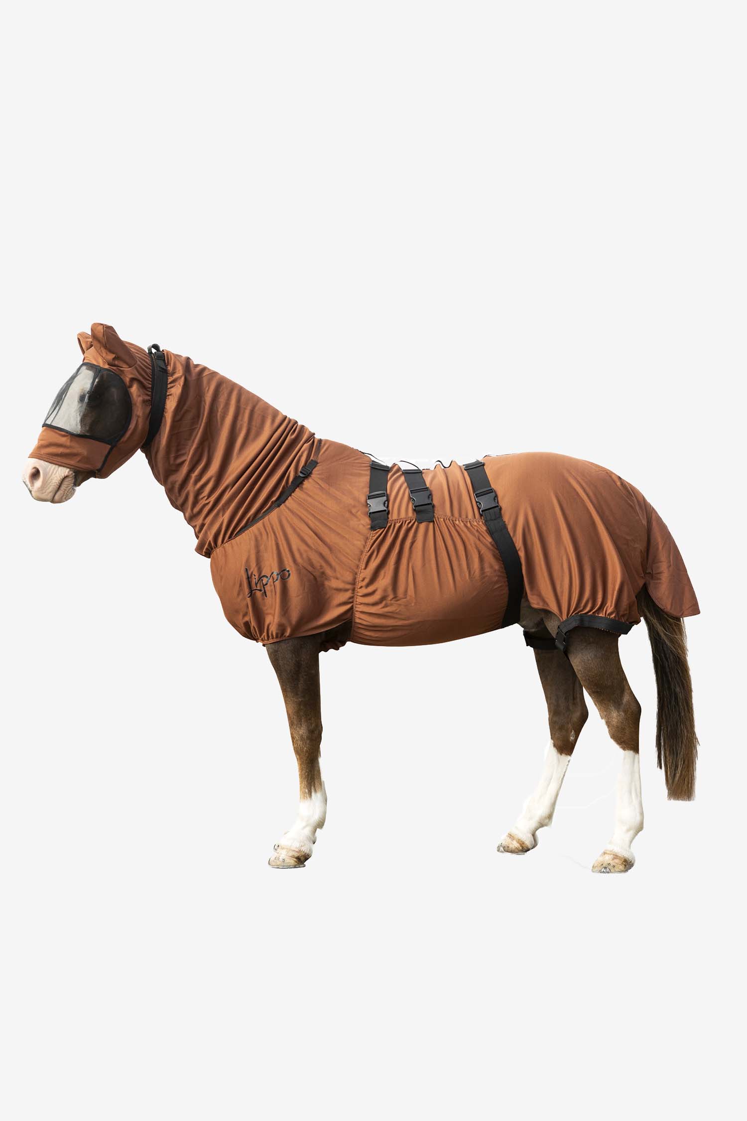 Dækkenet er vandafvisende og har god åndbarhed, hvilket gør, at hesten holder sig kølig selv på varmere dage. Dækkenet er heldækkende og tages på ved at trækkes over hestens hoved.