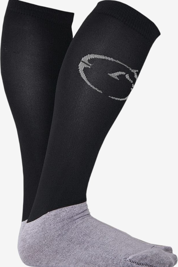 Riding socks from Italian Vestrum. Thin and flexible with a good fit. The shaft is very thin for the best feel against the horse. Made of elastic cotton and polyamide. Large logo at the top of the shaft. Gray foot.