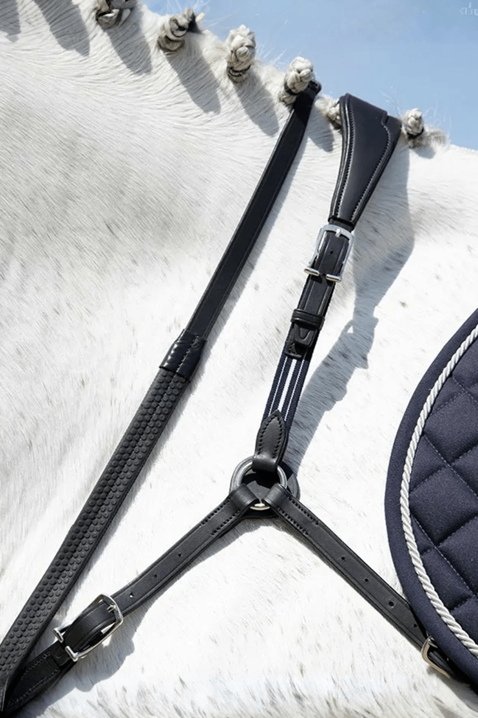 Elegantes Vorderzeug aus der Antarès Precision Kollektion. Lässt sich einfach an den Sattelgurtstrupfen oder am Sattelgurt befestigen, um mehr Stabilität zu bieten. Gefüttert mit Kalbsleder. Schnallen und Ringe aus Edelstahl.