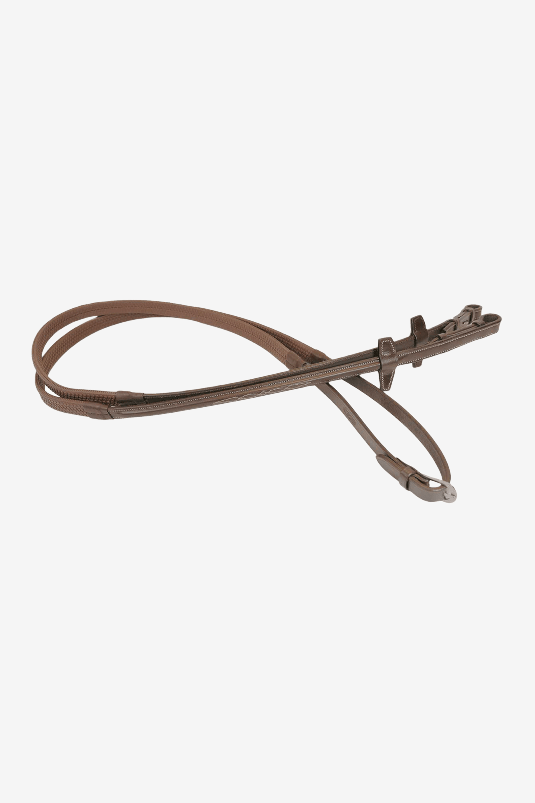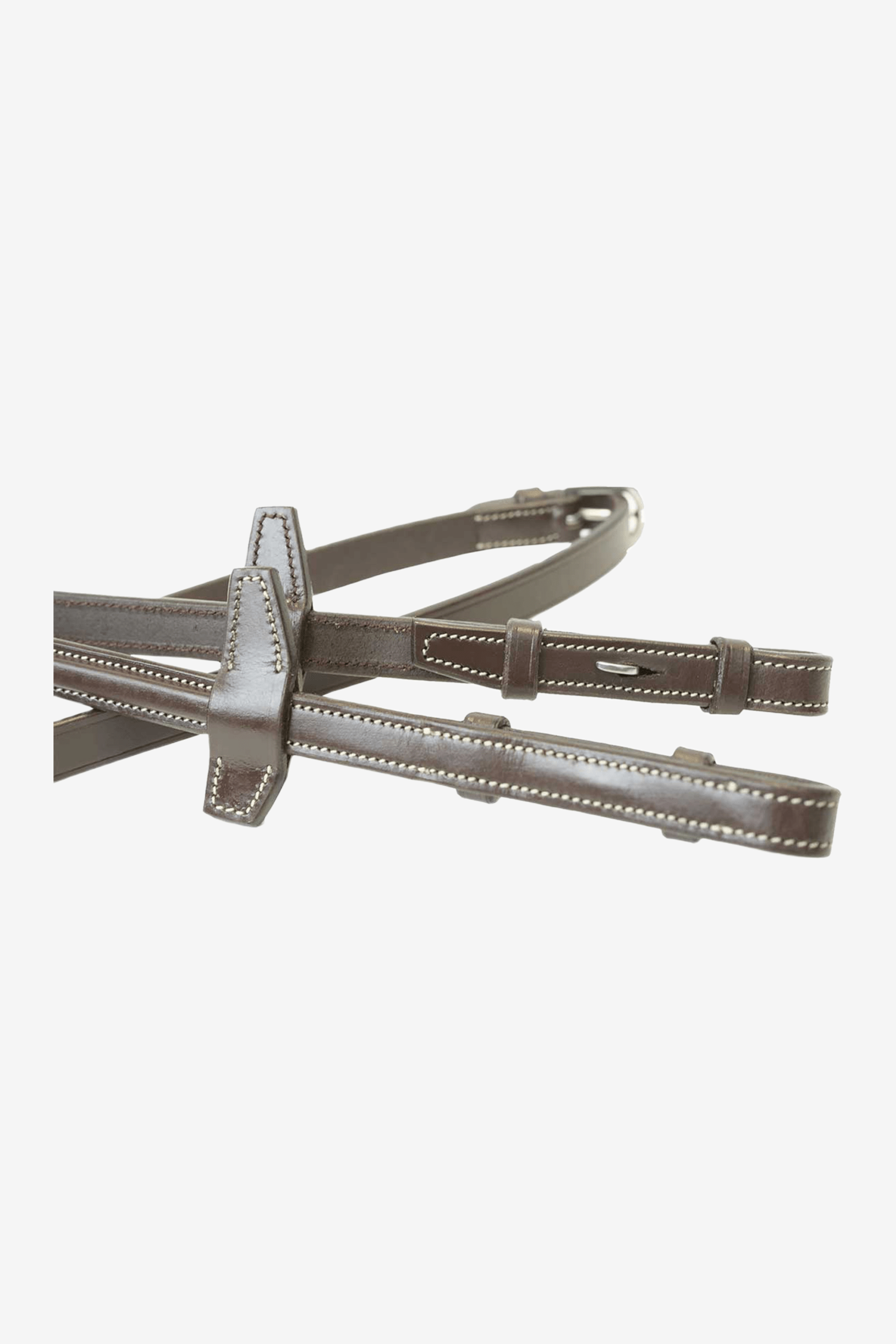 Tyglarna har ett grepp i brunt gummi och en elegant brodyr på läderdelen. Stopp för martingalringar i läder och snabbspännen med inåtvända krokar. Spännen i rostfritt stål.