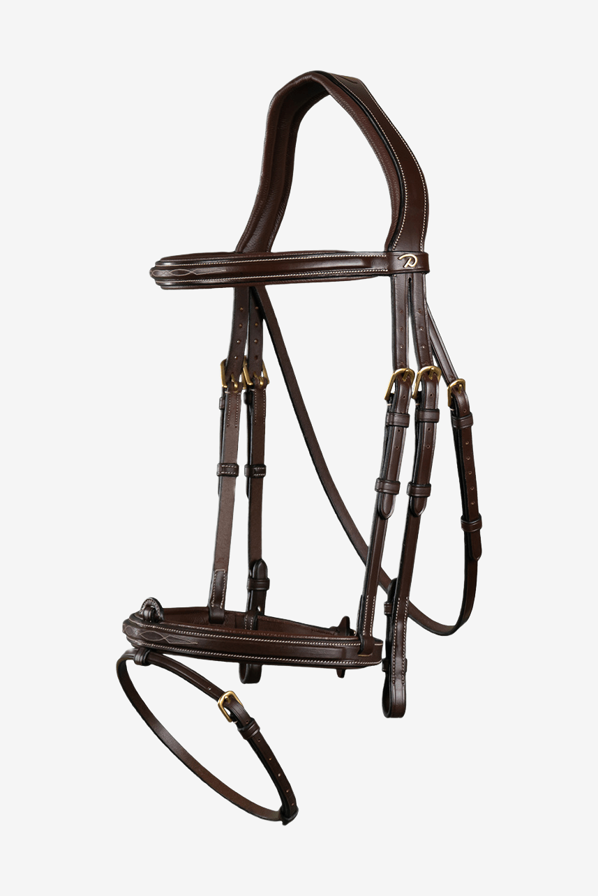 Träns Kombinerad Nosgrimma från Dyón Collection. Dyón har alltid haft fantastiska träns och nu har de kommit med ännu mer fantastiska nyheter. Nackstycket är smalare och mer anpassat efter hästens alla känsliga punkter på huvudet. Ett träns gjort på mjukt läder från Spanien med spännen i mässing samt fina vita mönstrade sömmar.