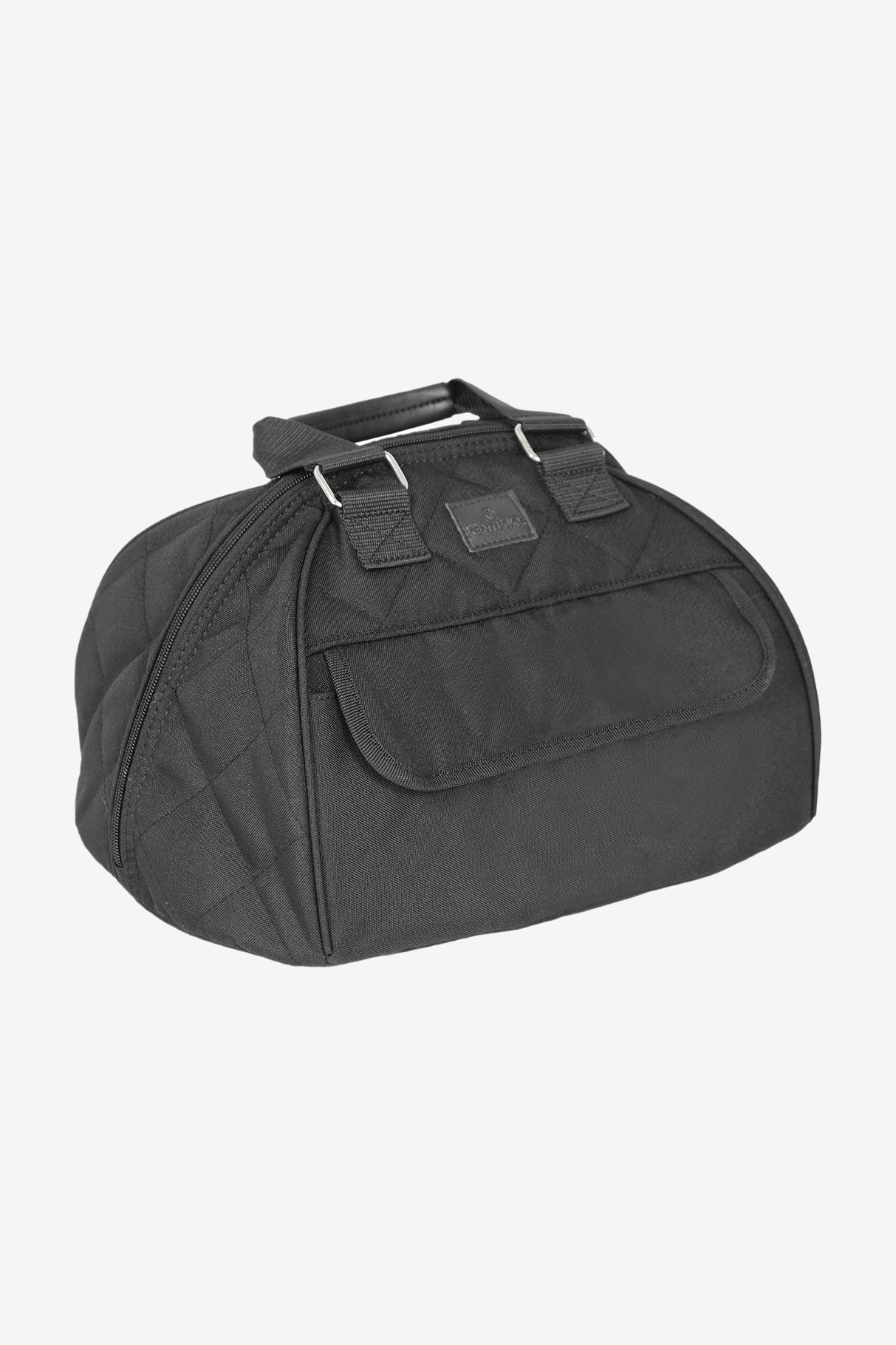 The exterior is made of durable quilted material with pockets where you can store smaller items such as gloves; the pockets close with snap buttons. The handles have a faux leather finish to give you a more comfortable feel. The bag features a sturdy zipper and is designed to fit most helmet models.