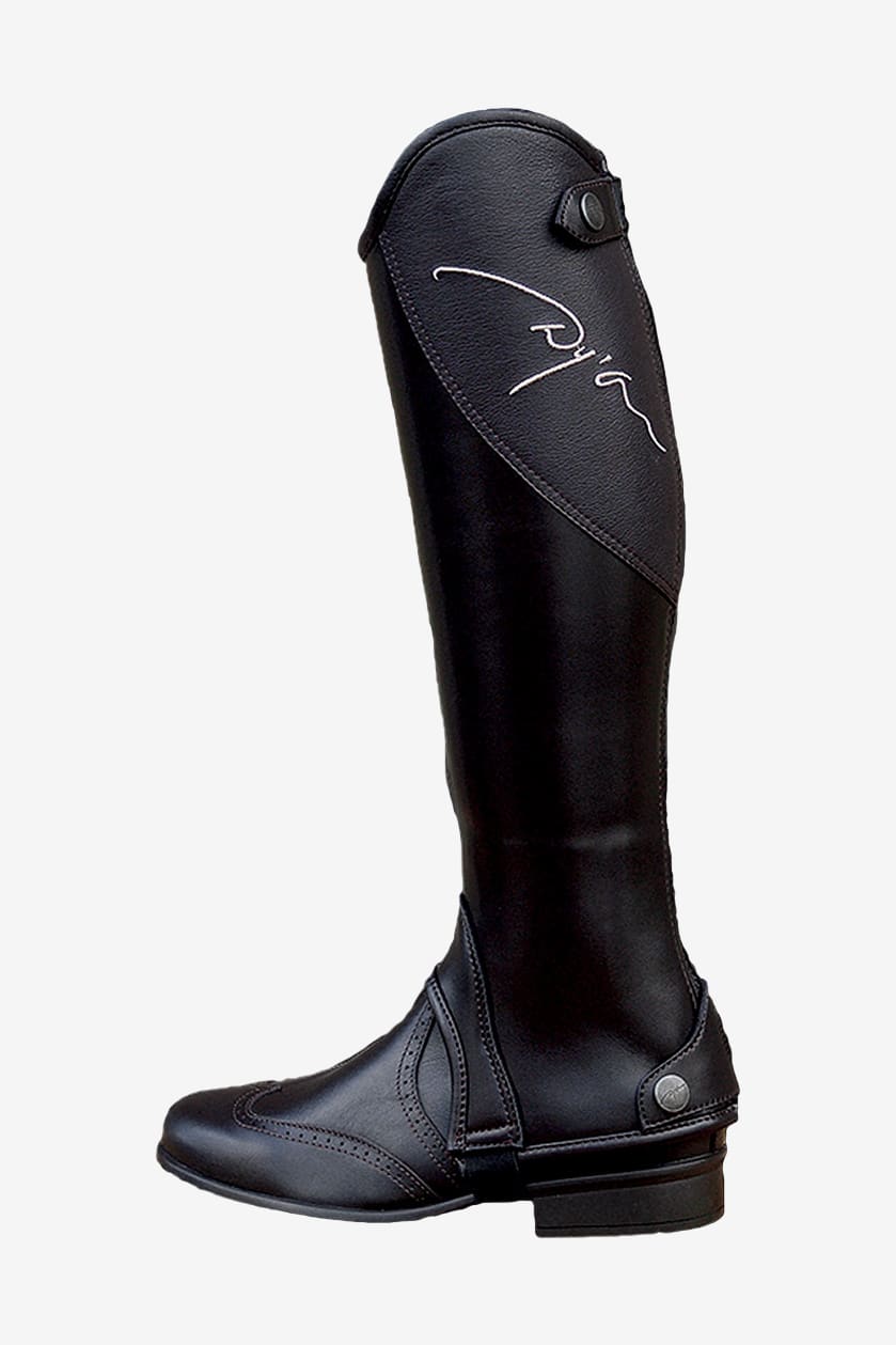 Super stylish short chaps in synthetic leather with a zipper at the back. Dyon logo embroidered on the side.