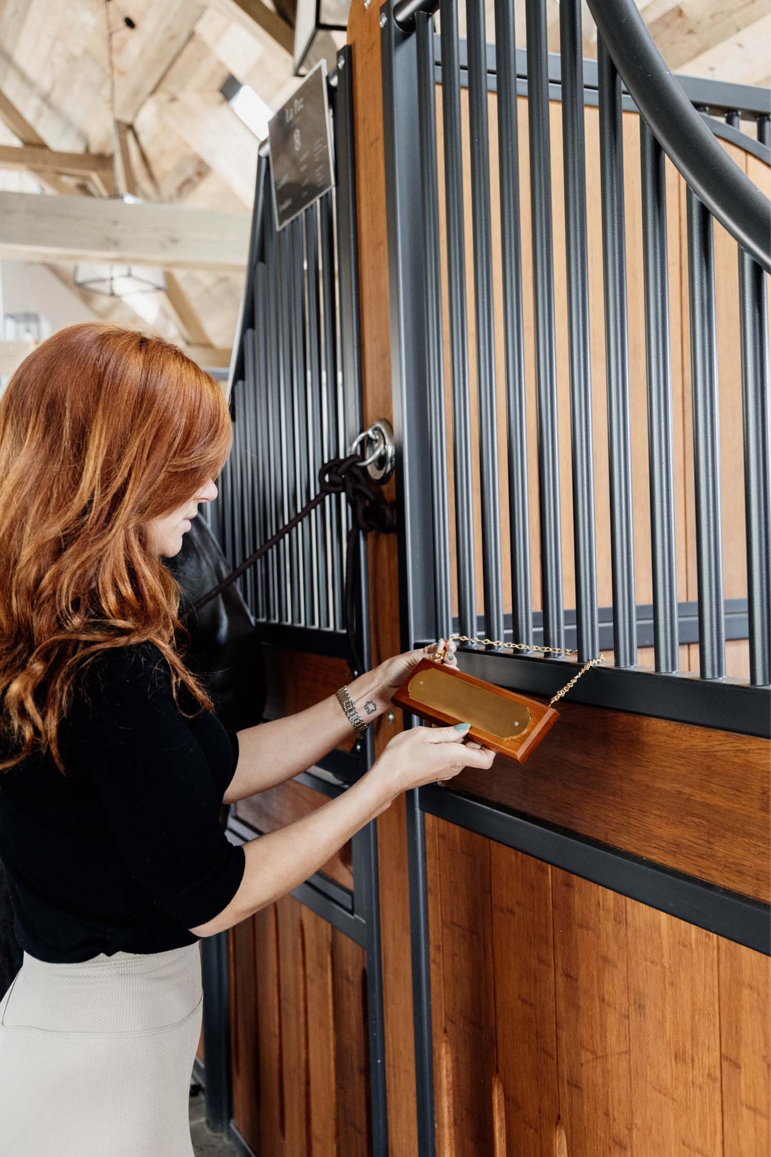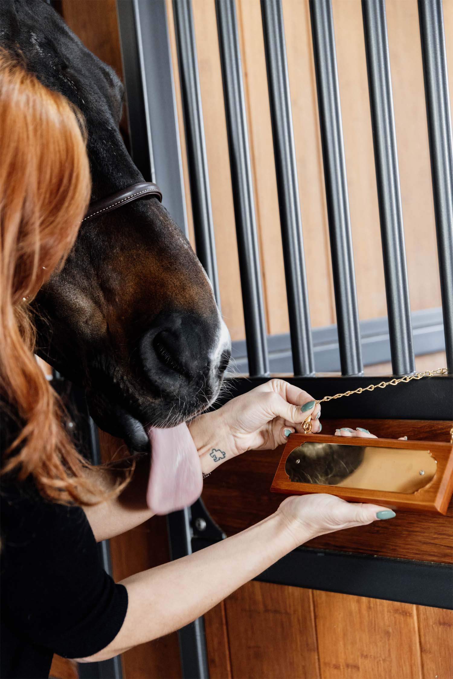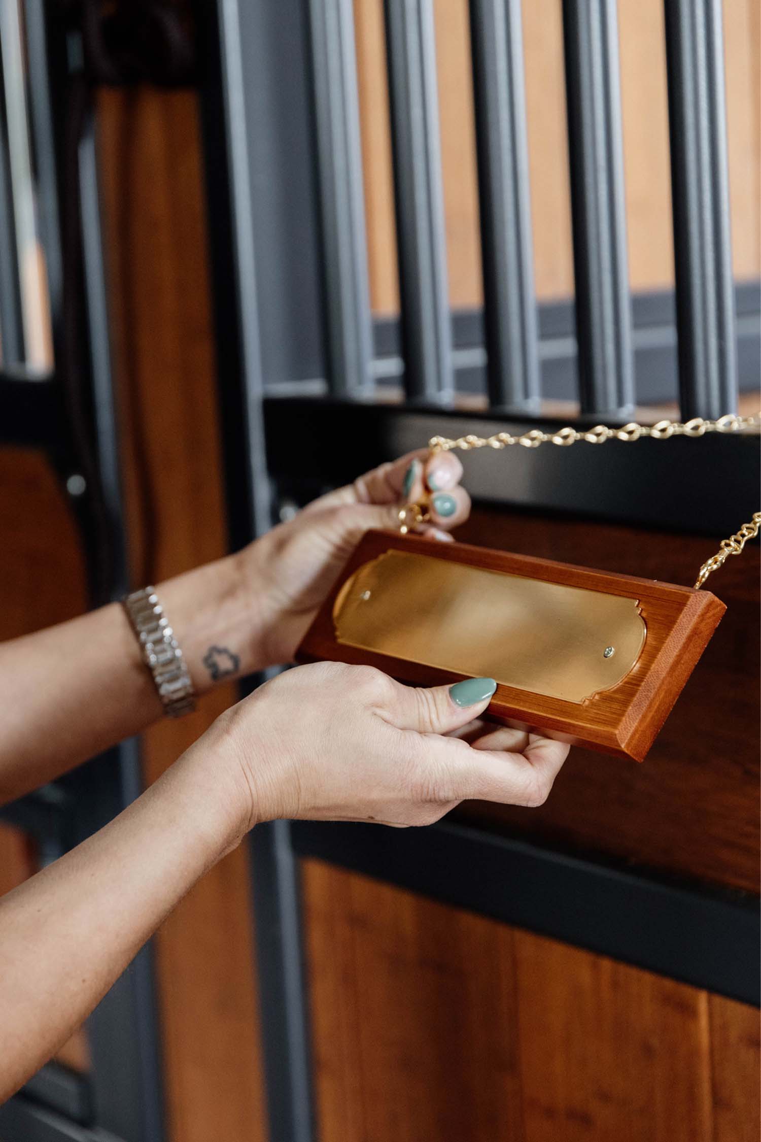 A stylish nameplate that you can place on your horse's box door, adding an elegant touch to your stable. Easy to customize as you can easily unscrew the metal plate to engrave it.