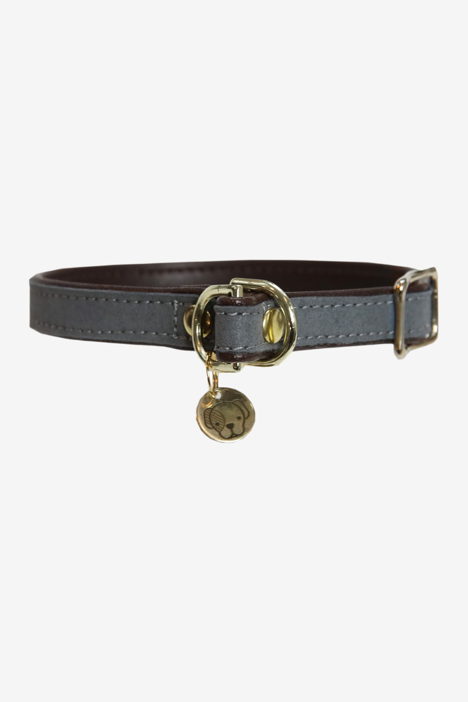 The collar has a ring to attach the matching dog leash. The small charm with the Dog Paw logo can be engraved with the dog's name on the other side.