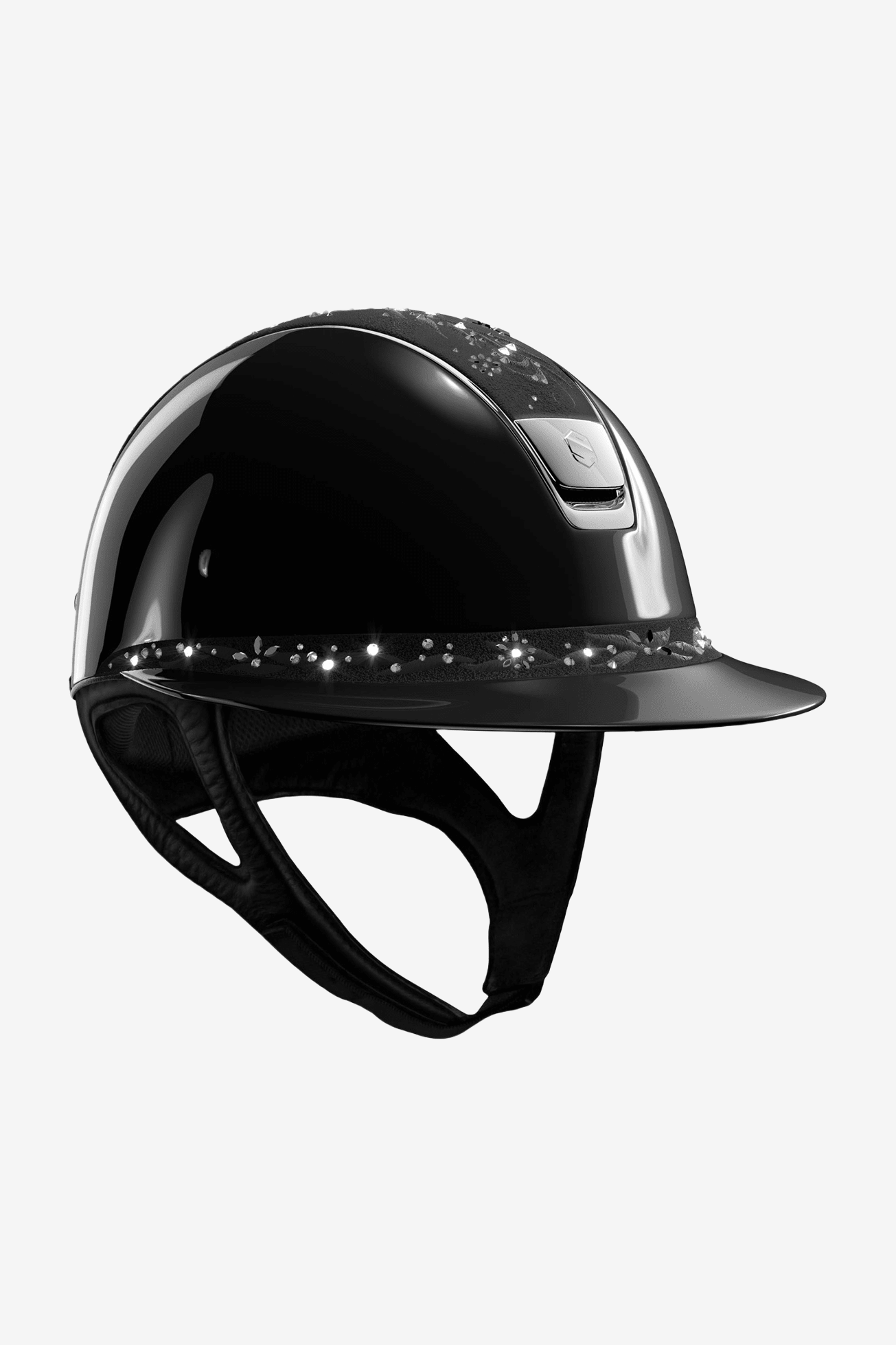 Glossy shell with sun visor and Top and Frontal Band with Flower Jewelry Black/Black and Silver Chrome on Trim and Blazon.