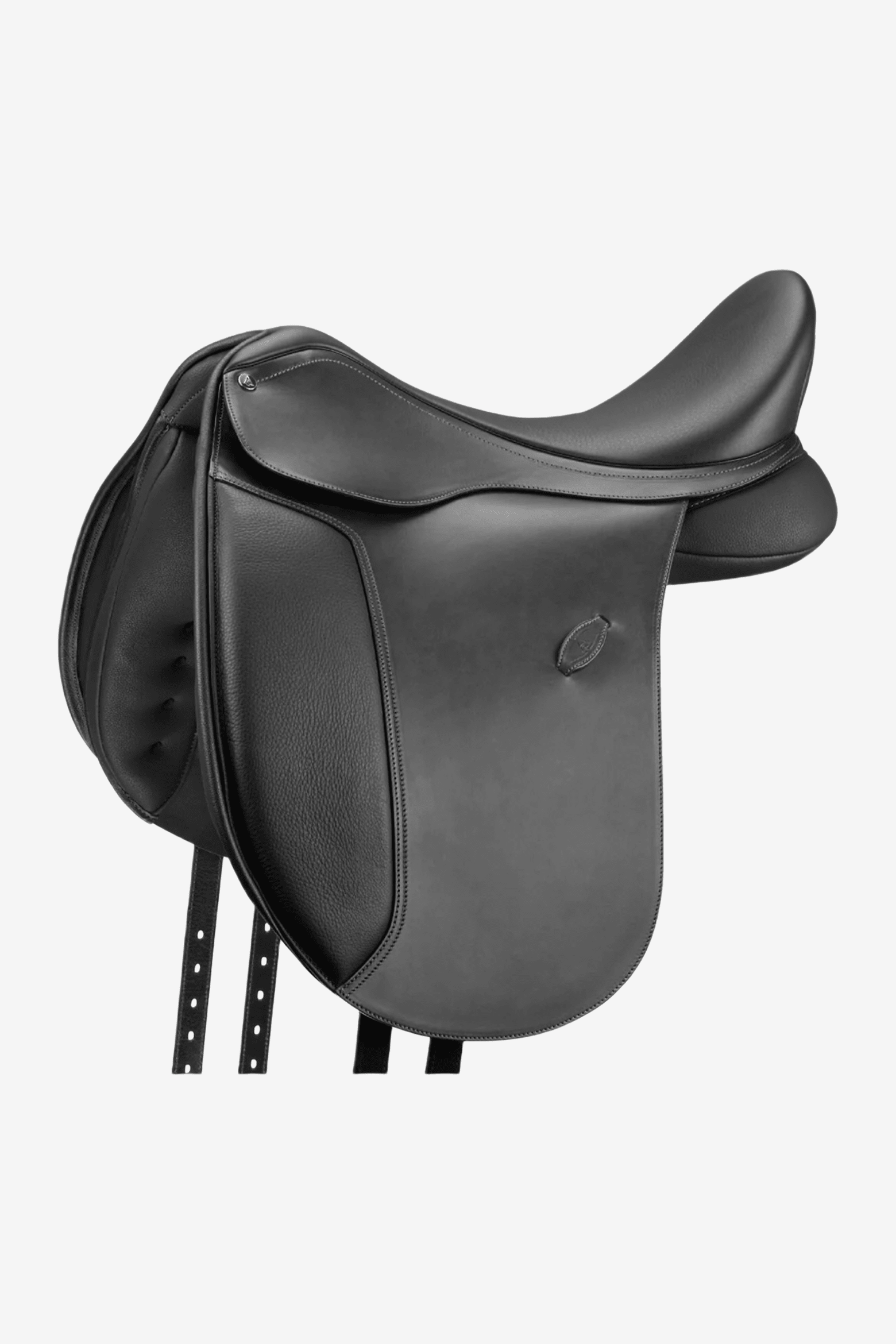 Une selle de dressage bien équilibrée en modèle poney de Arena Saddles, fabriquée par Bates. La selle est en cuir européen avec un travail artisanal soigné. Panneaux Care rembourrés à l'air et arçons interchangeables permettant d'ajuster facilement la largeur de la selle au cheval. Le panneau est plutôt droit mais peut être ajusté avec des inserts Easy Change pour s'adapter de façon optimale au cheval. L'assise offre une sensation de close contact et un bon soutien pour l'équilibre.