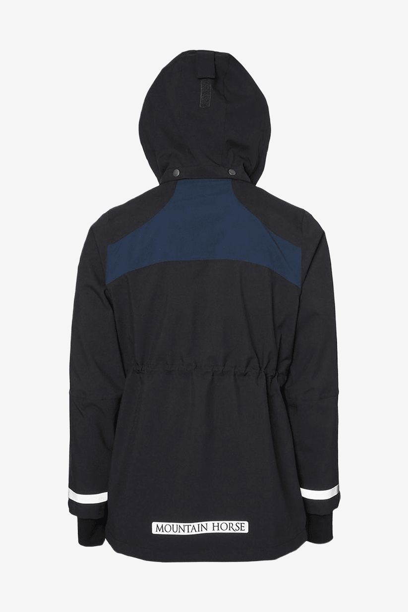Allvädersjacka från Mountain Horse som är fullt tejpad. Gjord i ett material som är både vatten och vindtät men fortfarande andas bra. W.P.S 5000. Även dragkedjorna är vattentäta. Något feminint skurven i formen. Tvåvägs YKK® dragkedja framtill. Fickorna framtill samt på insidan stängs även dom med dragkedja. Justerbar i midjan. Skyddande inre frontslå med hakskydd och huvan är avtagbar. Armarna är för-böjda. Justerbar i armslut.