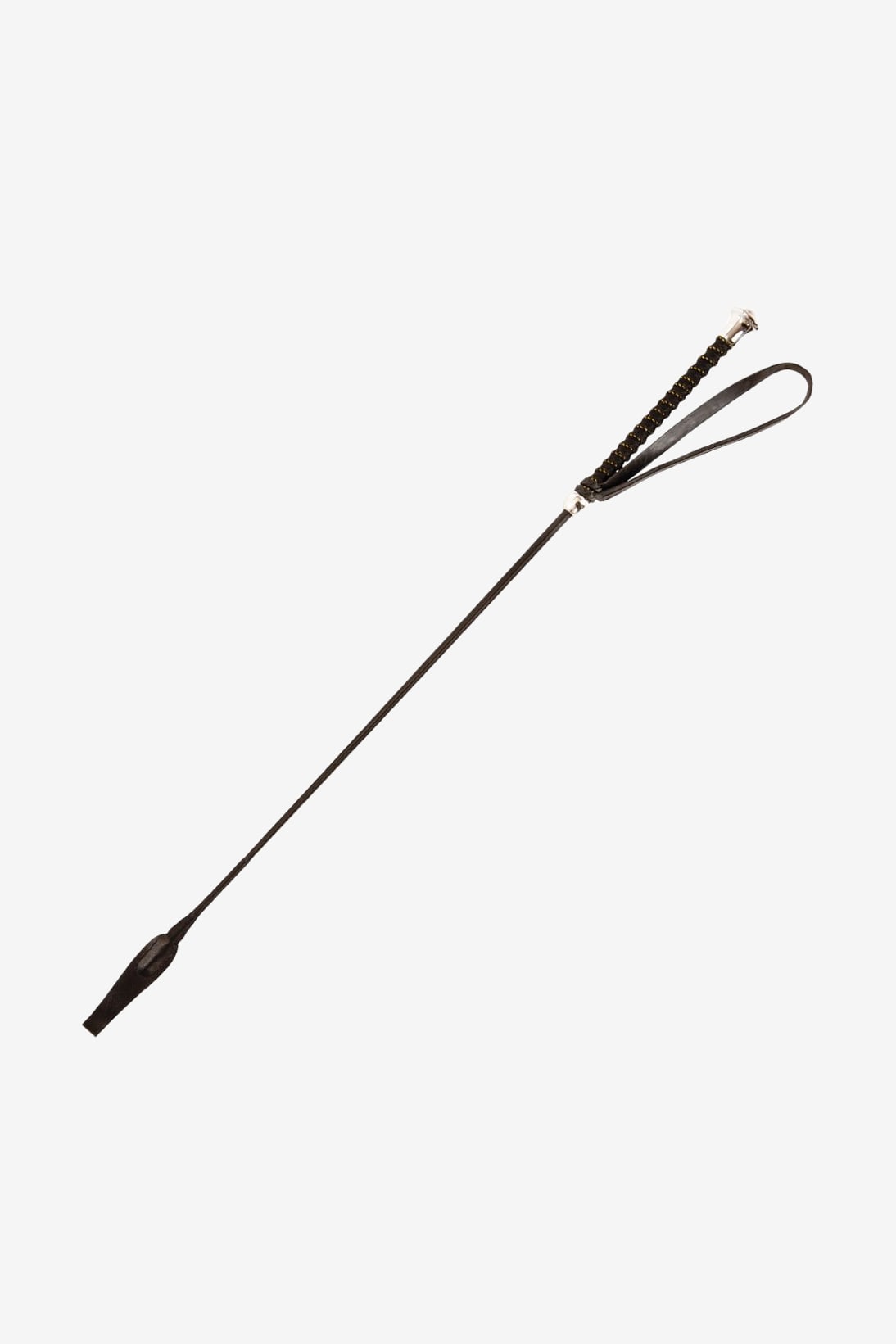Cravache avec âme en fibre de verre recouverte de nylon, poignée en nylon/argent, pommeau argenté et claquette en cuir.