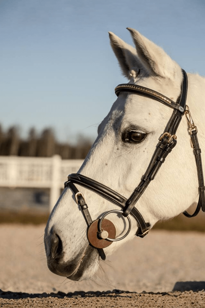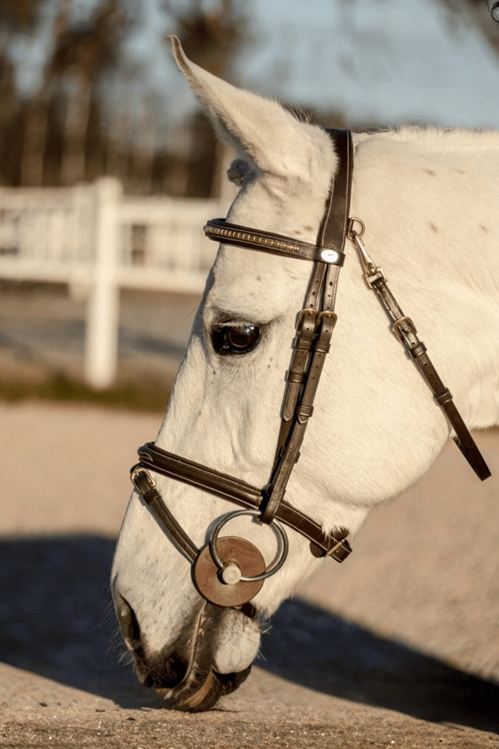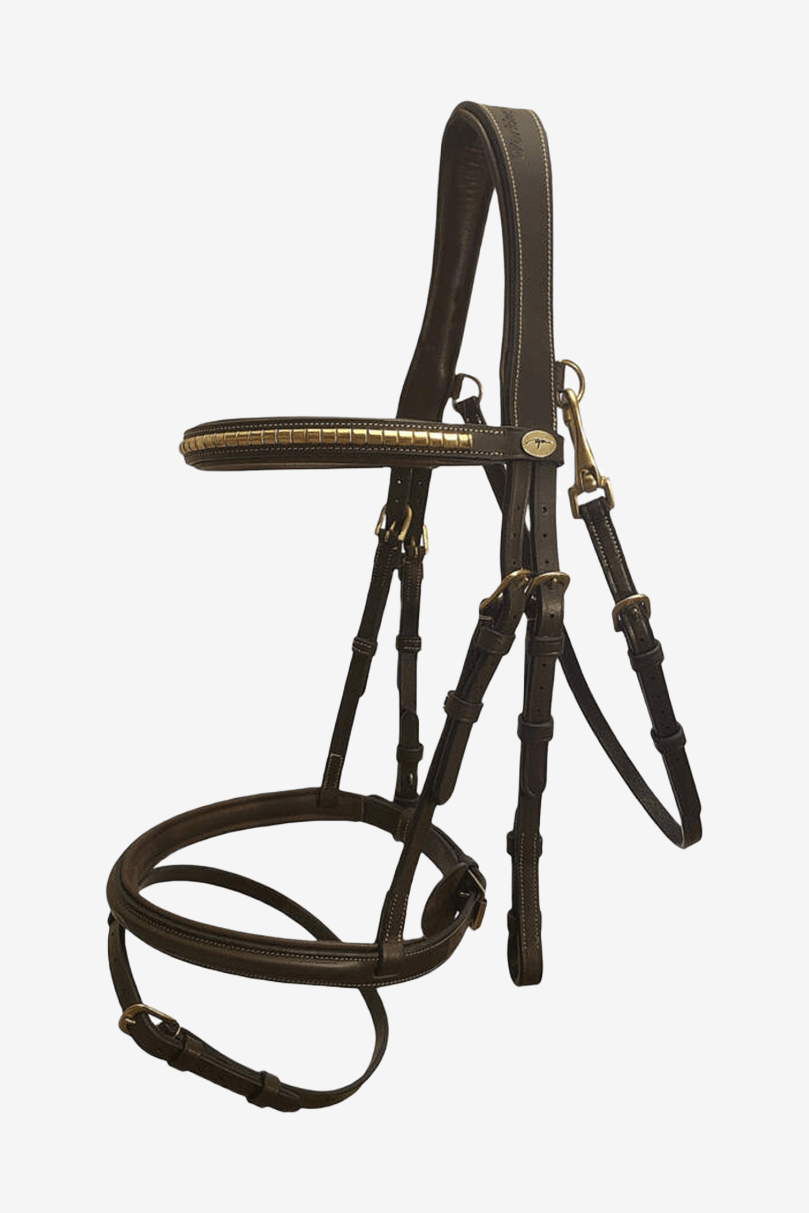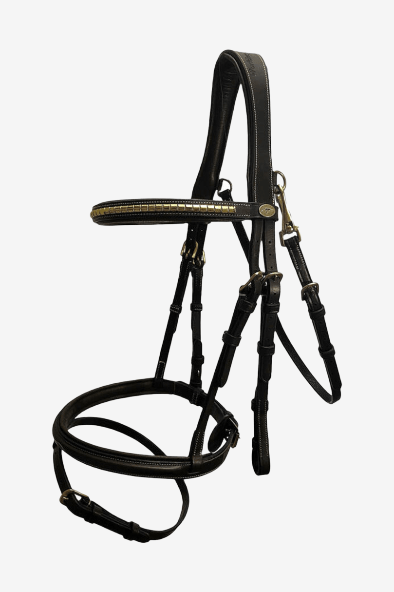 Superfint träns från Dyon med klassiska klinkers. Tränset är i vattenbuffelläder med kombinerad nosgrimma och snabbspänne på käkremmen.