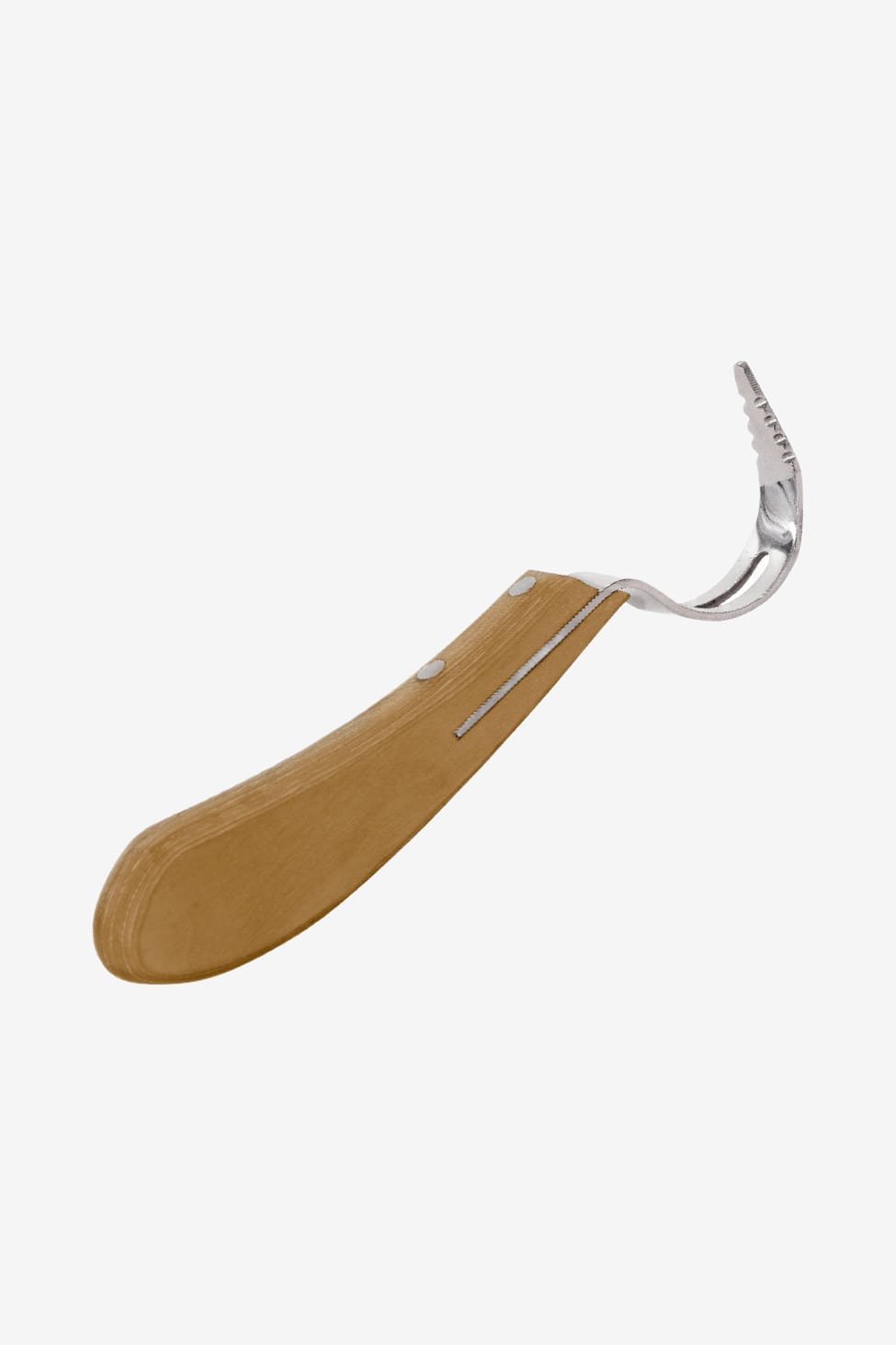 Un cure-pied robuste avec un crochet en acier inoxydable et des bords dentelés. Poignée ergonomique solide en bois huilé.