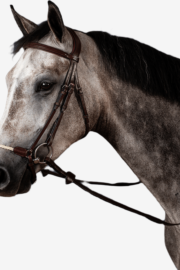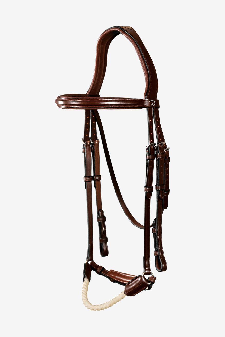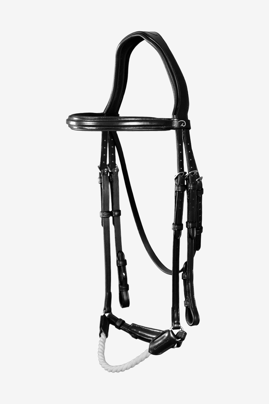 Träns från Dyón – New English Collection. Anatomiskt träns med Remontnosgrimma i rep. Dyóns nya träns kombinerar komfort med stil och är tillverkat av det finaste lädret. Nackstycket är lite bredare med en utskärning för öronen och är vadderat med 2 mm neopren. Tränset har tre remmar för nosgrimman, sidostycket och käkremmen. För att undvika tryck som orsakas genom att nosgrimman trädes över nacken, sätter man fast nosgrimman direkt i tränsets tredje sidorem. Spännen: Silver.