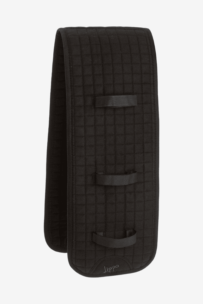 Longeeronderlegger/longerenonderlegger van fijne, stevige katoen met een katoenen binnenzijde en bies rondom. Verstevigd aan de onderzijde met borduursel. Aangepast aan Lippo's men- en longeersingel. Als een zadeldek, maar onder je longeren singel, vermindert het het risico op schuren en is het eenvoudig te wassen en schoon te houden.
