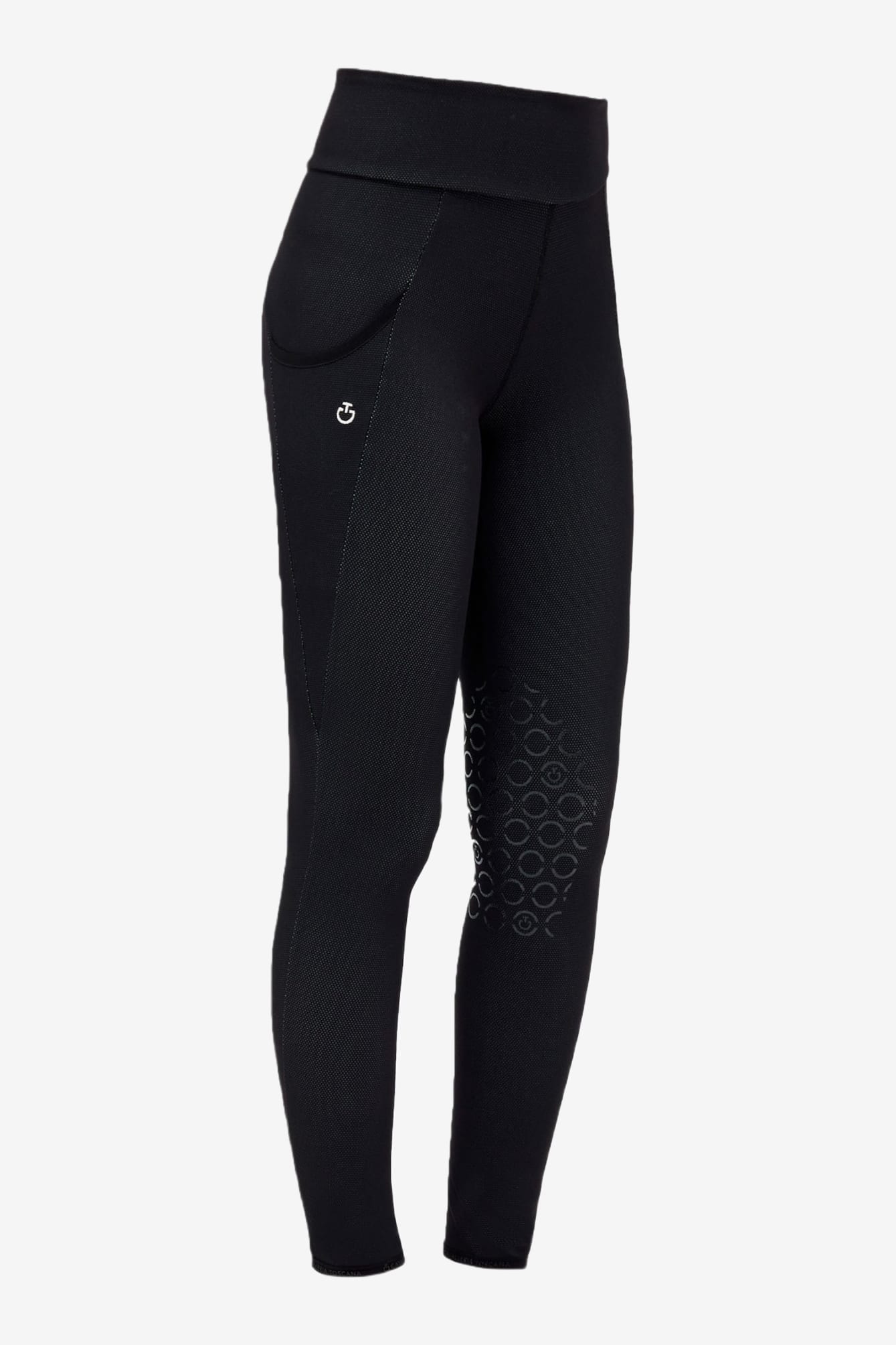 Trendy en comfortabele rijleggings van mesh van Cavalleria Toscana. Brede en elastische tailleband die goede ondersteuning biedt. Kniepatch met siliconen grip voor betere stabiliteit in het zadel. Geborduurd logo op het rechterdijbeen.