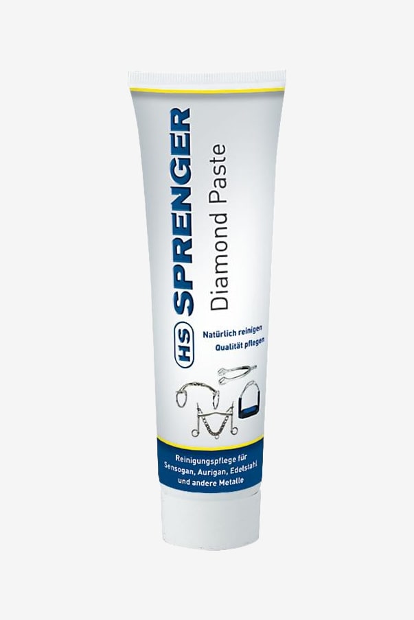 Fantastische formule voor glanzende bitten, sporen en stijgbeugels. De Diamond pasta reinigt, onderhoudt en herstelt de glans van Sprenger-producten. (Kan ook gebruikt worden op andere soortgelijke producten) Breng een kleine hoeveelheid Sprenger Diamond Paste aan op een spons of poetsdoek, reinig het oppervlak en poets voor extra glans. 100ml