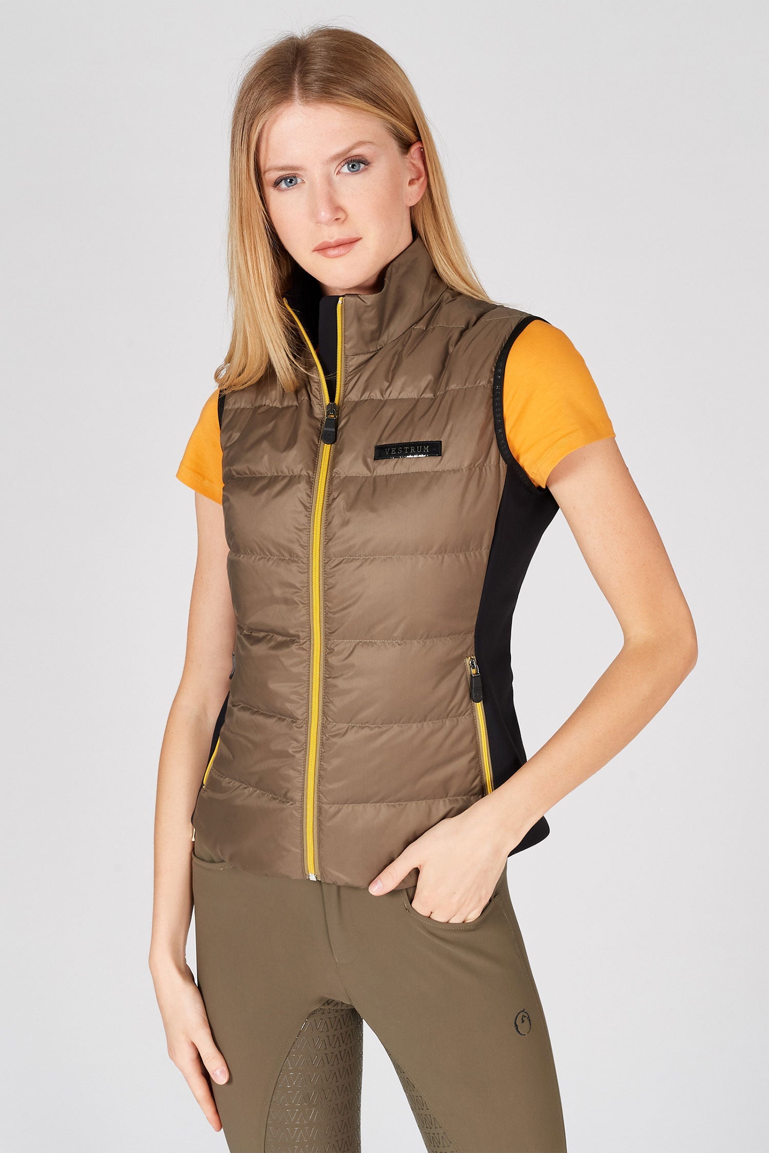 Een lichte en flexibele bodywarmer met ingenaaide stretchpanelen aan de zijkanten om belemmering te minimaliseren. Contrasterende ritssluiting met een binnenbescherming om vastzitten aan het shirt te voorkomen. Zakken aan de zijkant, ook met ritsen in dezelfde gele kleur. Twee strepen op de rug langs de wervelkolom en een logo in hetzelfde glanzende, licht rubberachtige materiaal.