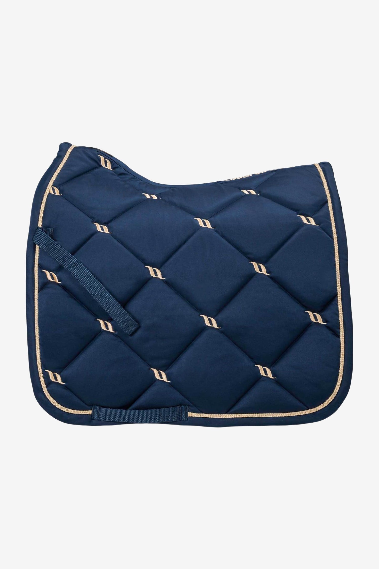 Het schabrak is marineblauw met elegante champagnekleurige details.
