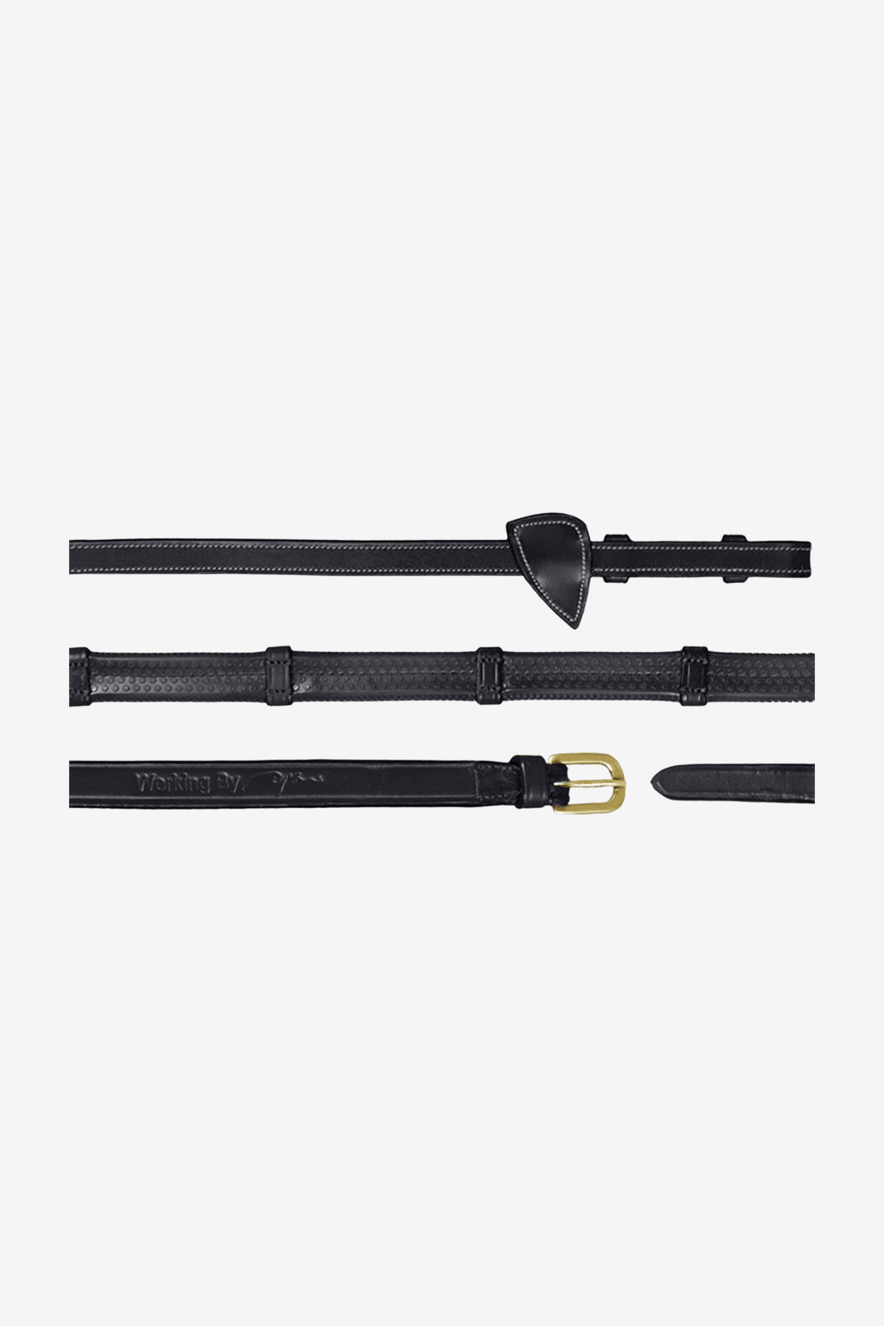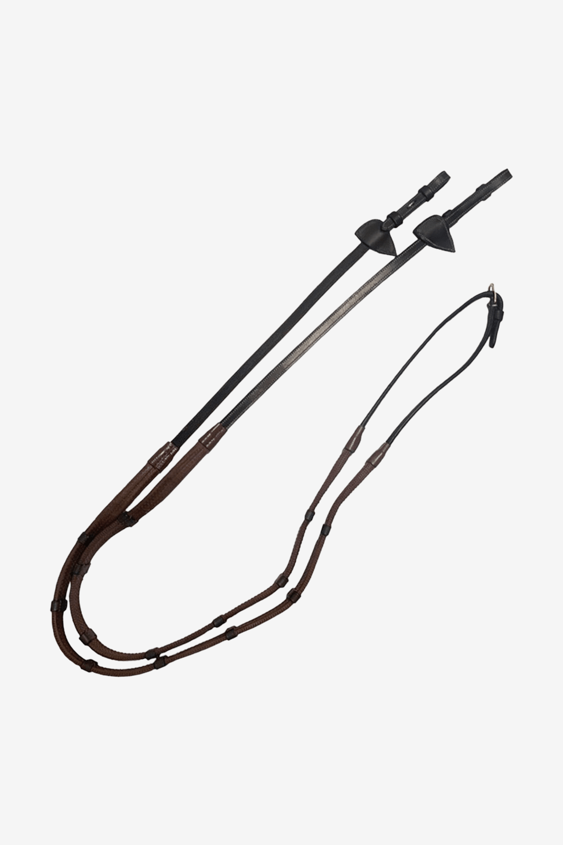 Prachtige rubberen teugels van Dyon met stops van fijn buffelleer en een naar binnen gerichte gesp. De teugels hebben messing gespen en fraai ontworpen martingaalstops.