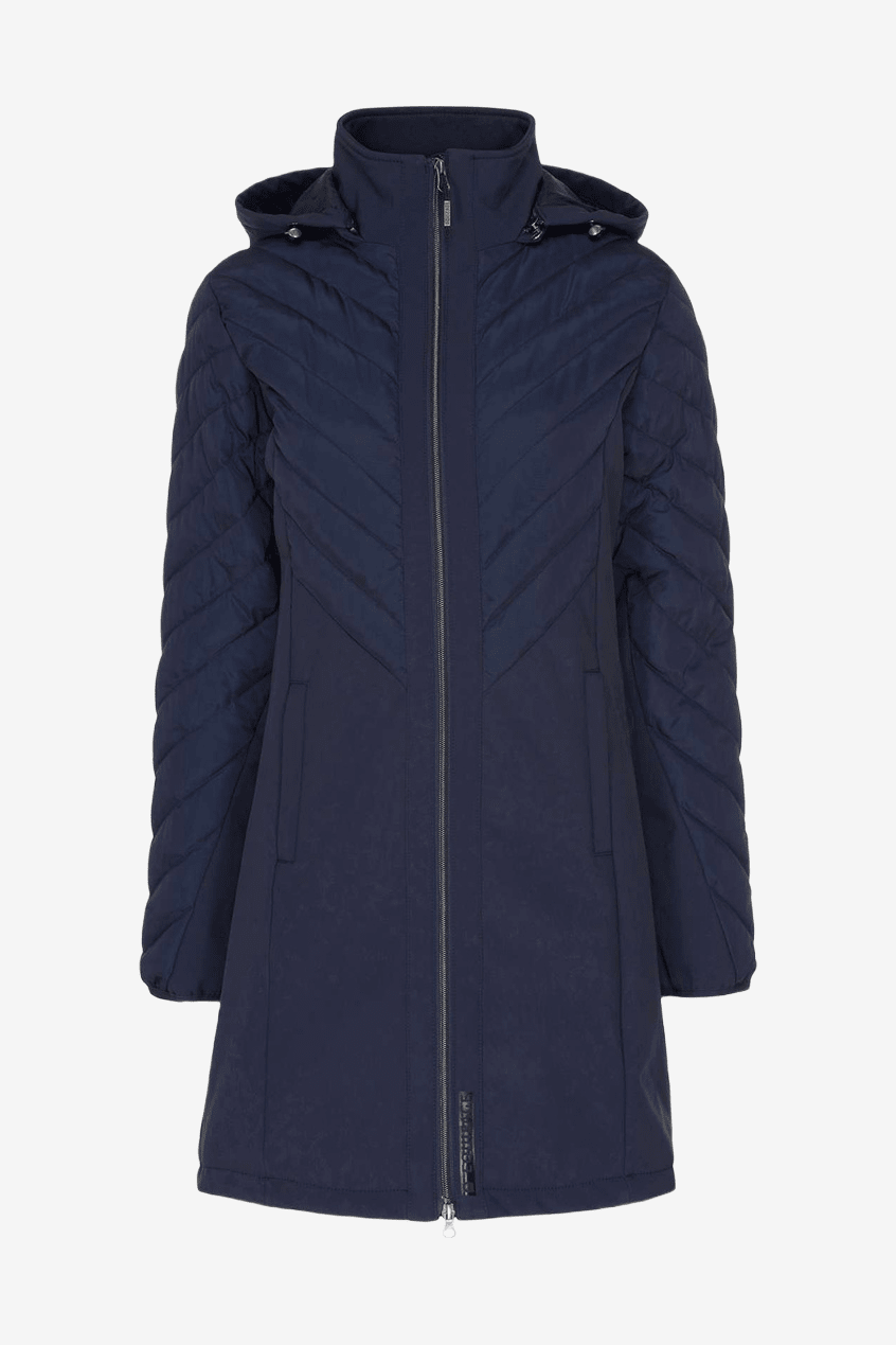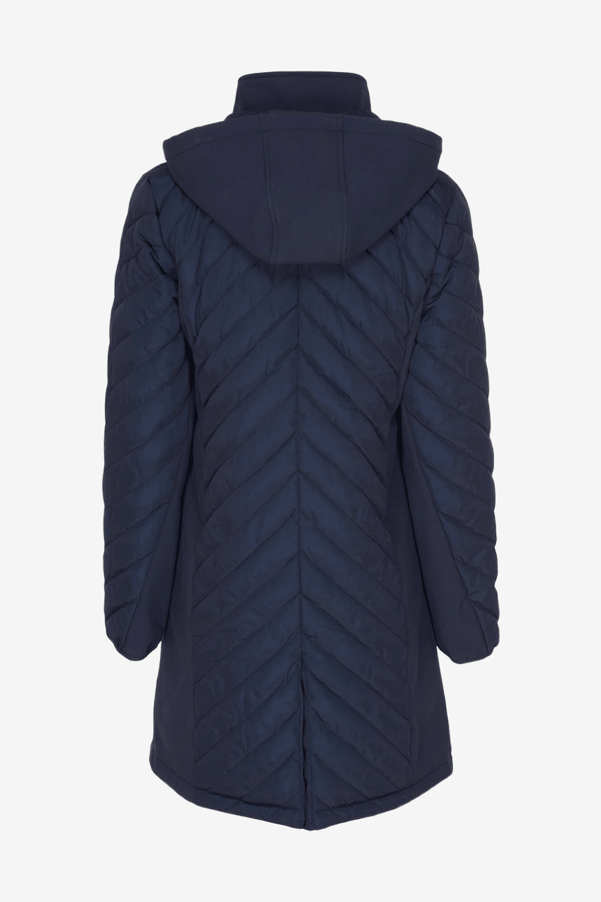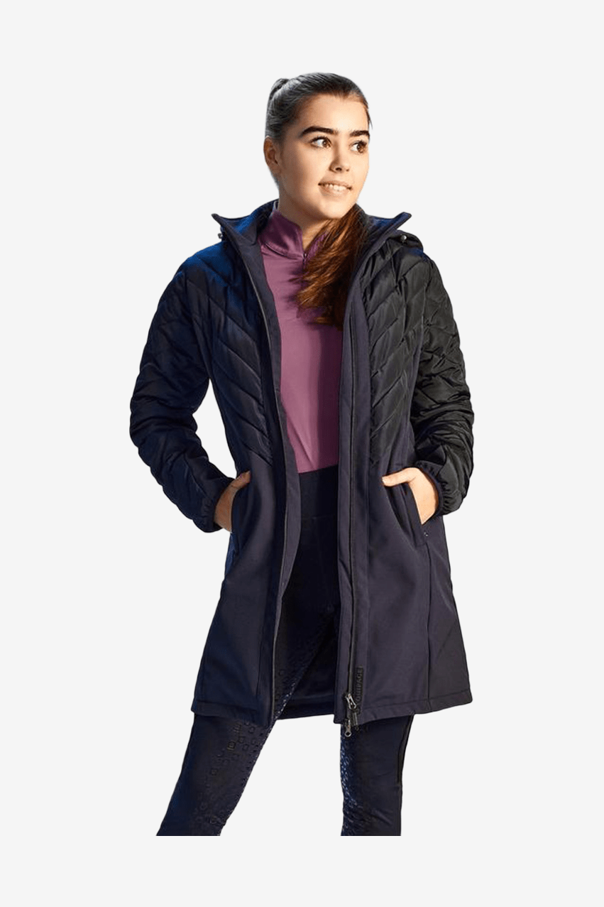 Jas in een hybride model met een gewatteerd bovendeel en mouwen, en een softshell onderkant. Het buitenmateriaal is waterafstotend en bestand tegen lichte motregen. Het hybride materiaal maakt de jas licht en flexibel, en hij kan gemakkelijk onder een dikkere jas worden gedragen wanneer het koud wordt. Tweewegrits aan de voorkant en een afneembare capuchon die ook verstelbaar is met elastische banden.