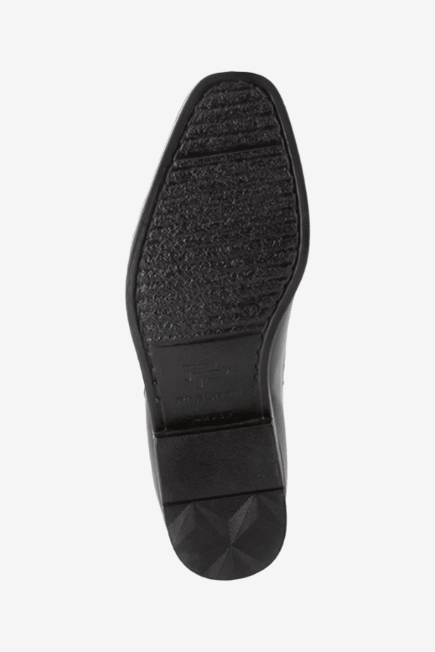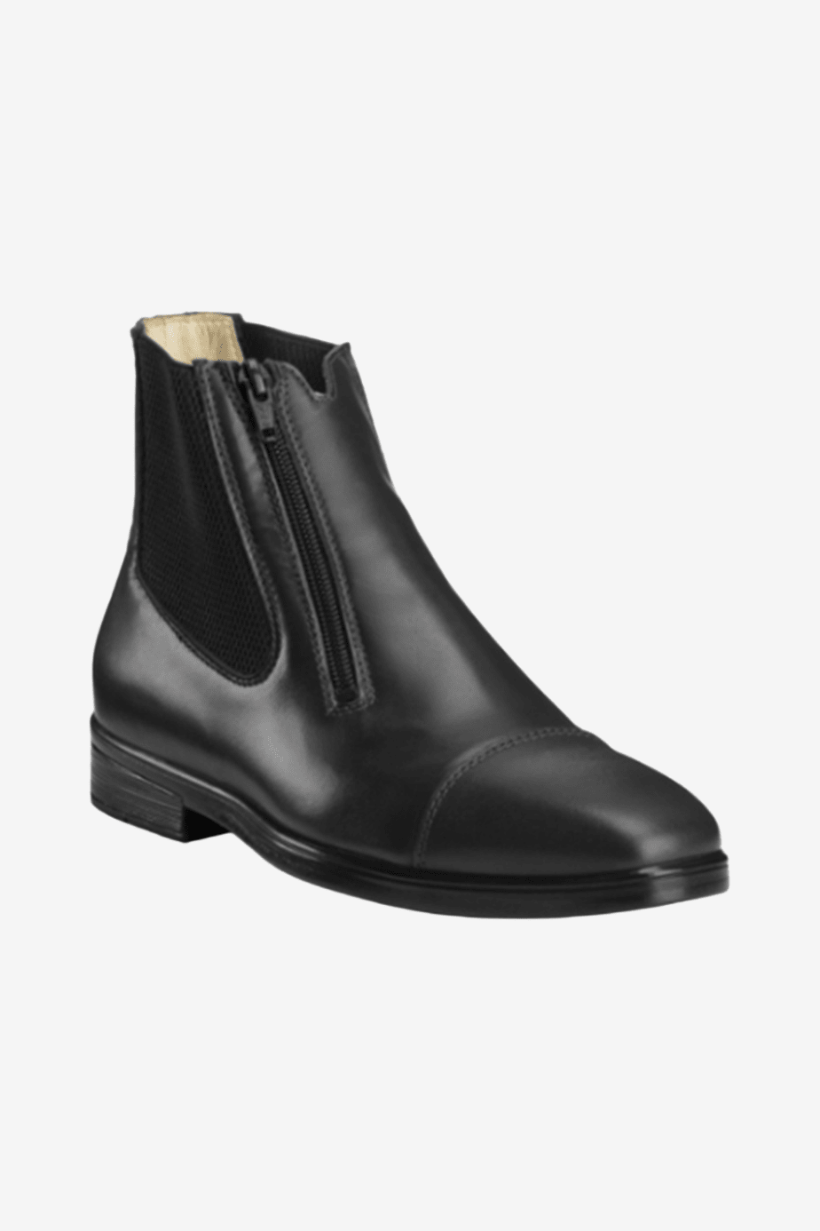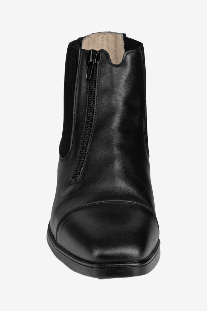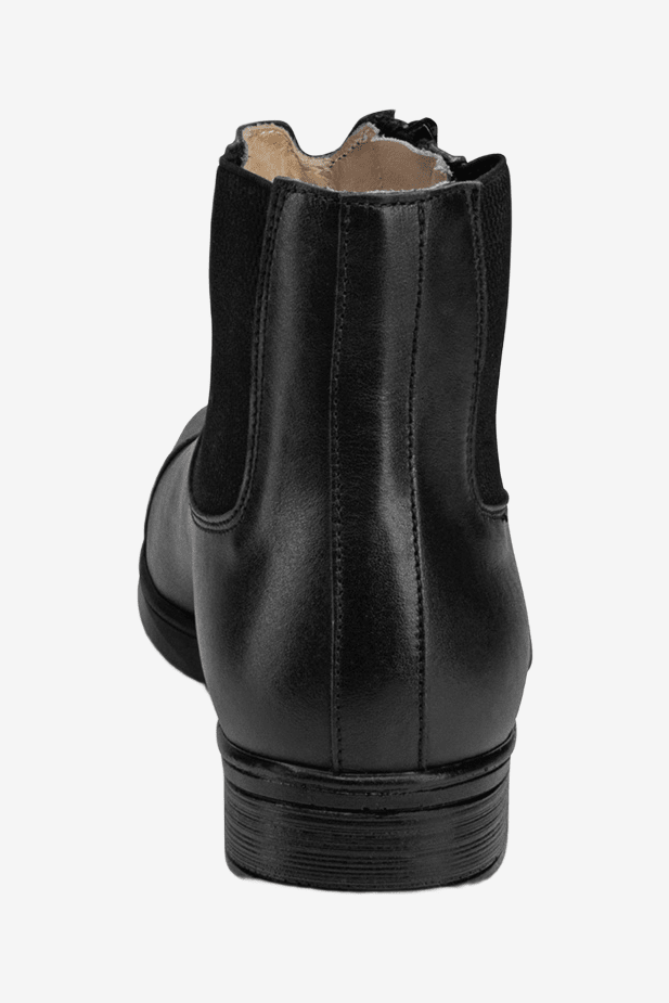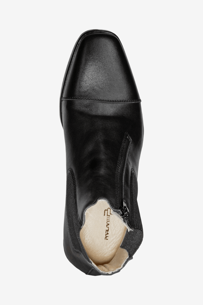 Gemaakt van kalfsleer. Schuine rits met elastisch paneel zorgt voor een perfecte pasvorm.