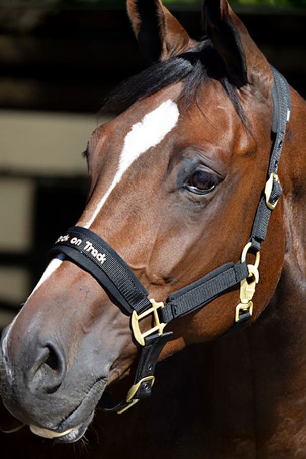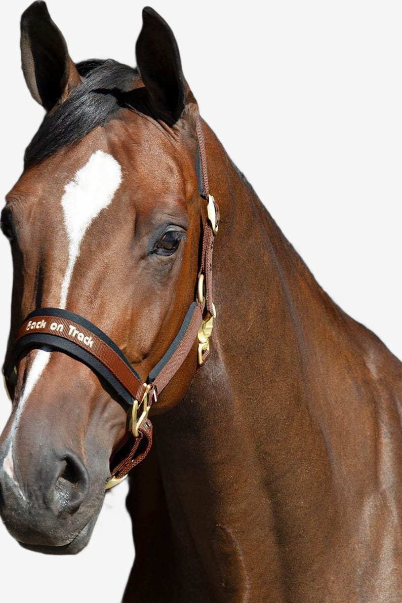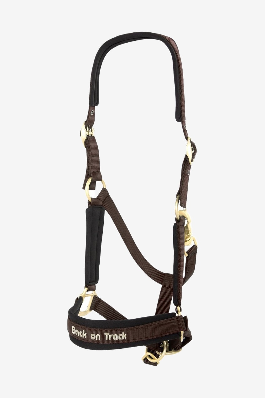 Grimman är brun med eleganta, guldfärgade metallspännen. Enkel justering och tillpassning till din hästs storlek både vid sidostycken och runt nosen. Smidig att stänga med en karbinhake.