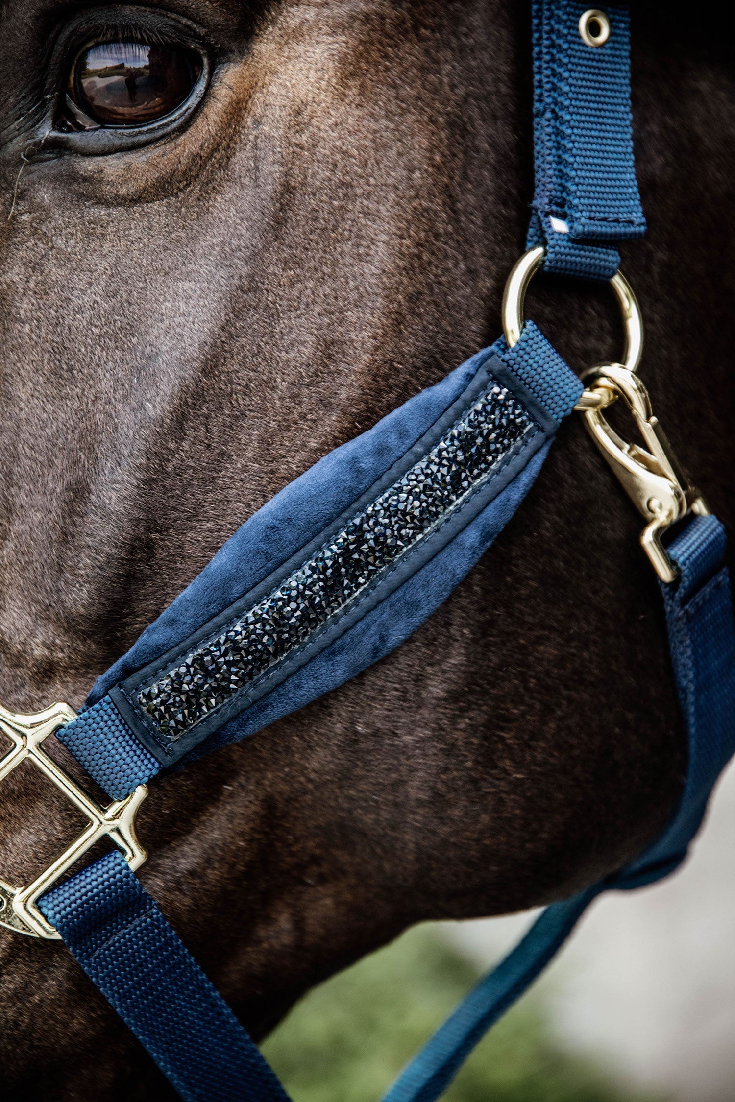 Oprócz eleganckich aksamitnych detali, nachrapnik i paski policzkowe ozdobione są błyszczącymi kamieniami. Kantar przyciąga wzrok. Rozmiar kantara można regulować po obu stronach paska potylicznego, a dzięki zapięciu na zatrzask z boku jest łatwy do zdjęcia.