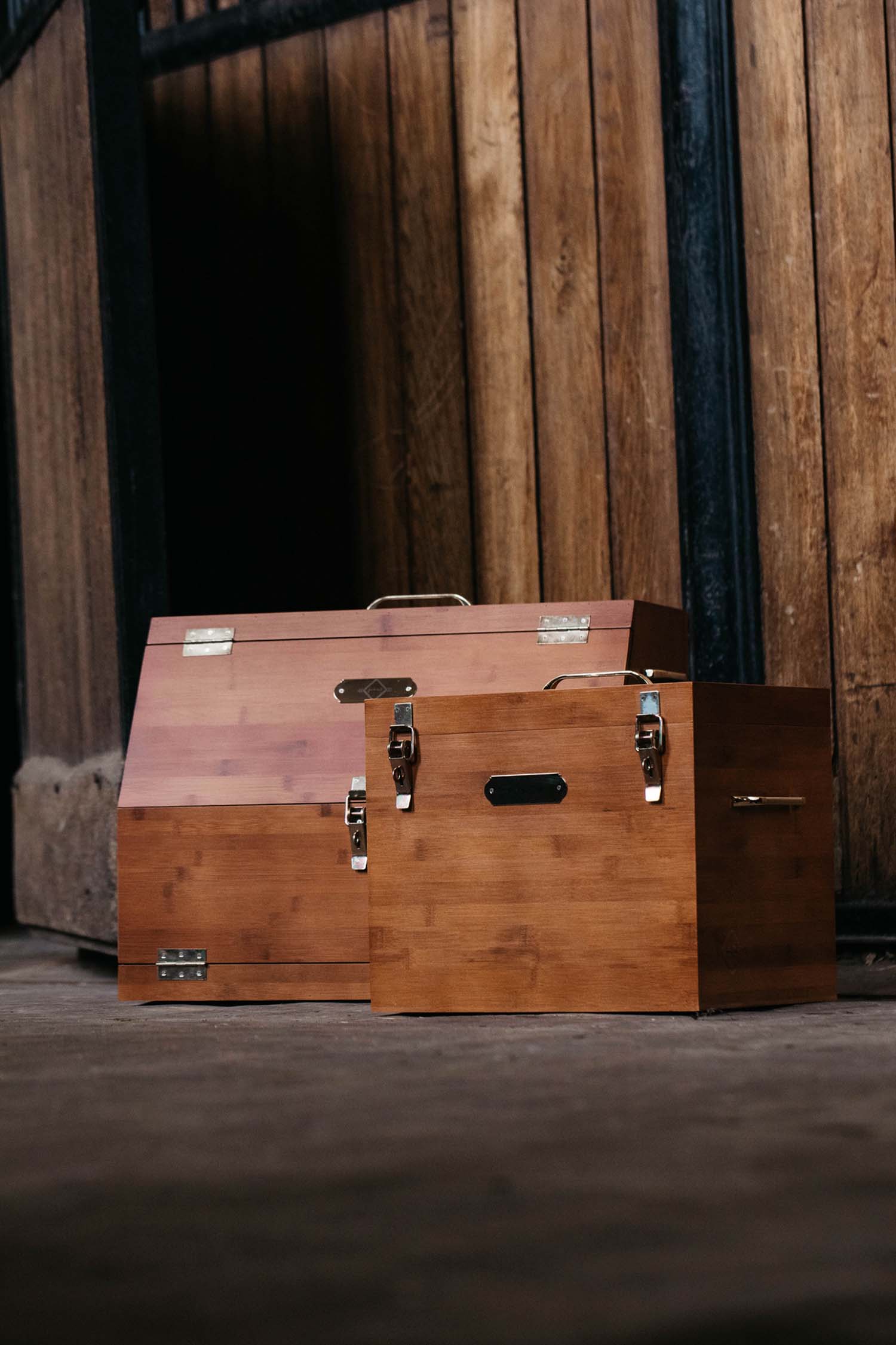 Górna część otwiera się i może być zamknięta za pomocą dwóch złotych okuć, które można również zabezpieczyć kłódką. Wewnątrz znajduje się duża komora (25x38x26 cm), którą można podzielić na dwie lub trzy części dzięki 2 cienkim, wyjmowanym przegrodom. Możesz zorganizować wnętrze swojej skrzynki w unikalny sposób!