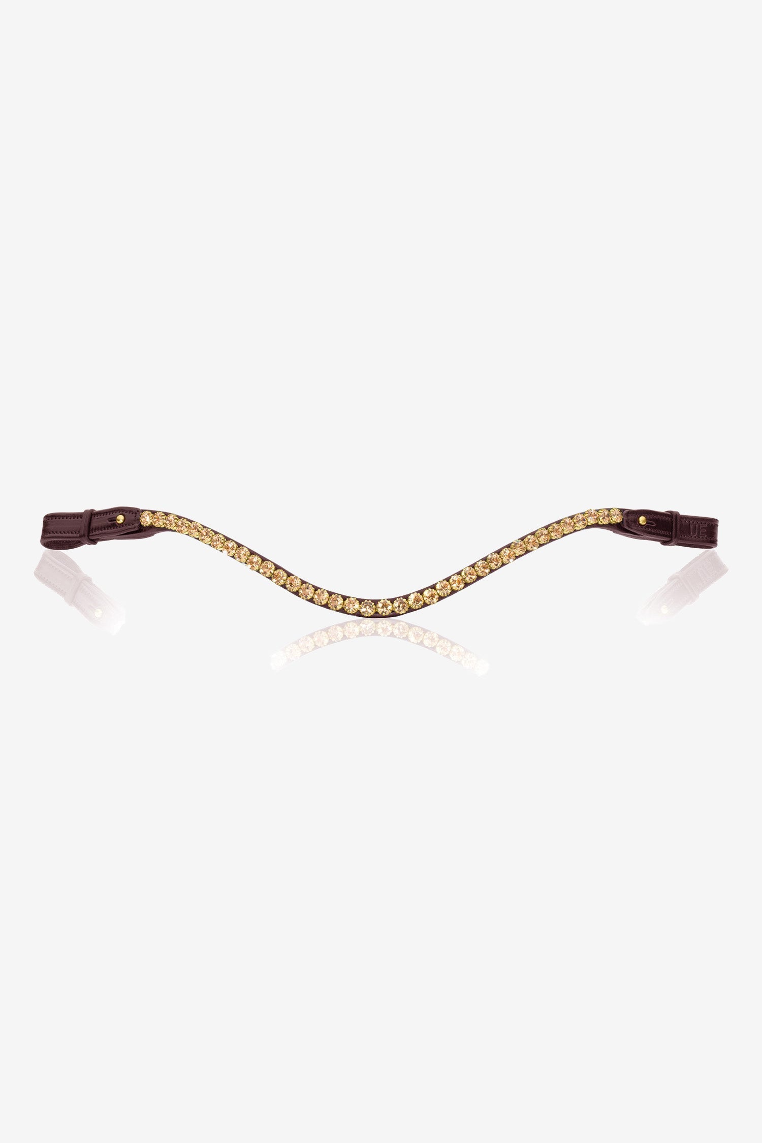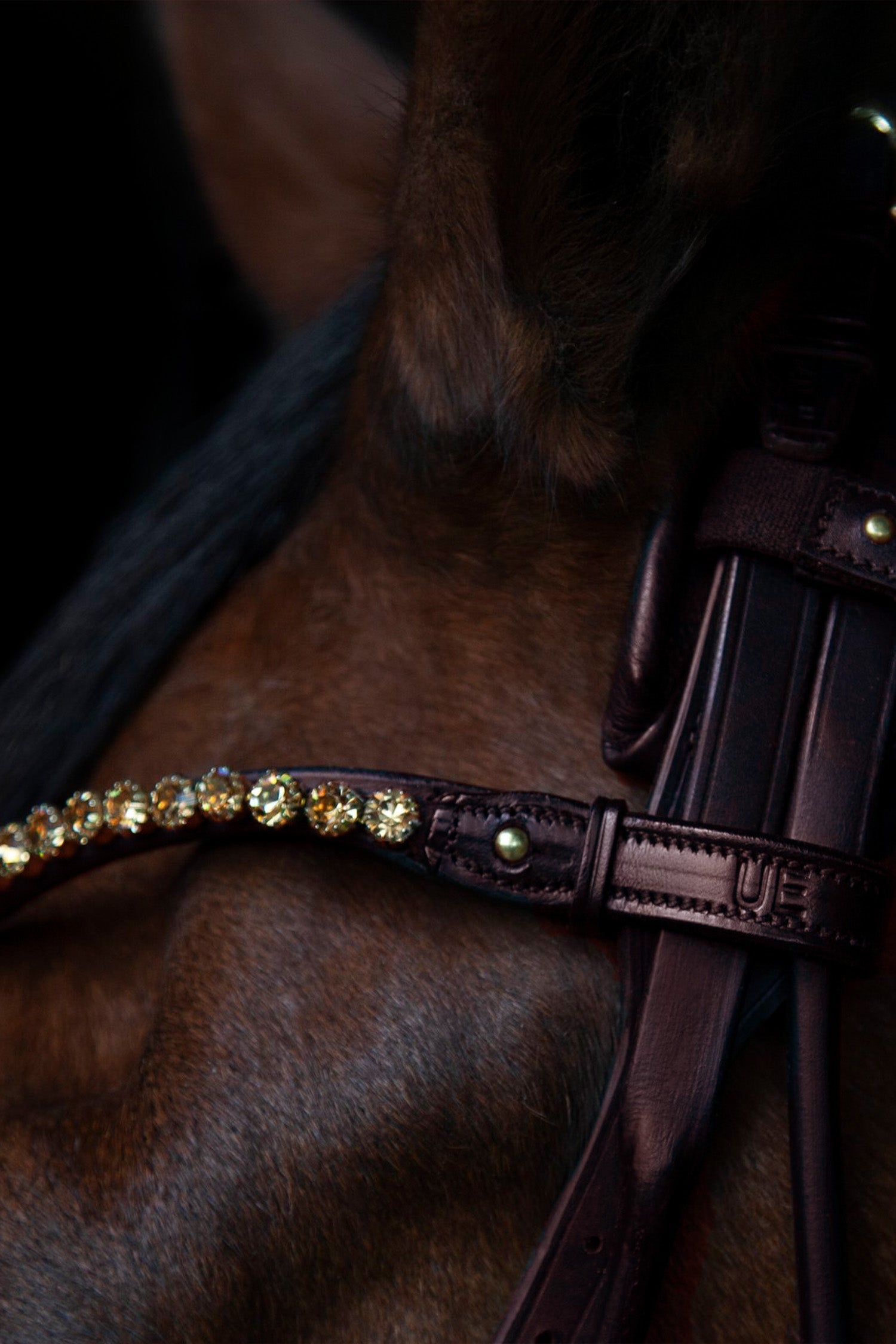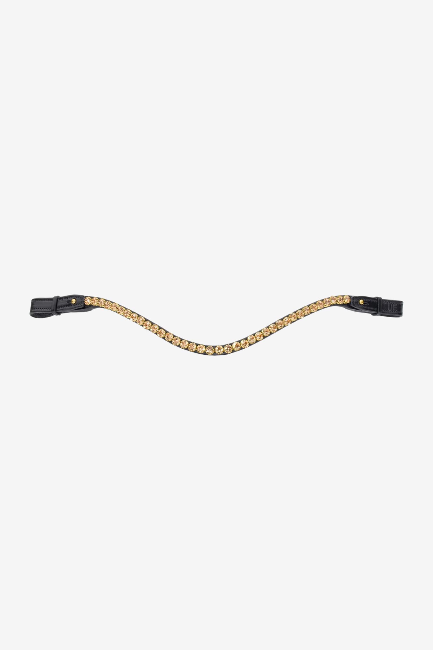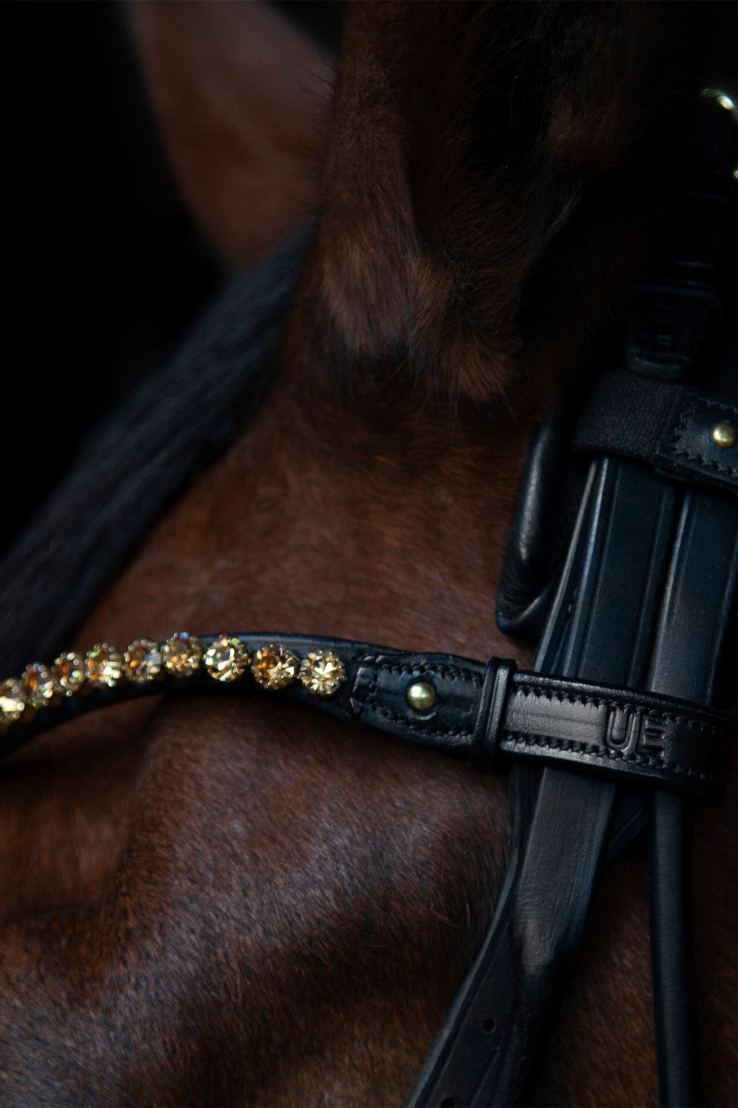 Naczółek w kolorze czarnym ze złotymi kryształkami od Utzon. Naczółek jest ręcznie wykonany z włoskiej skóry roślinnej, z kryształkami Rivoli o średnicy 12 mm. Produkt posiada zapięcie po obu stronach, co umożliwia łatwe zdejmowanie z ogłowia bez konieczności jego rozkładania.