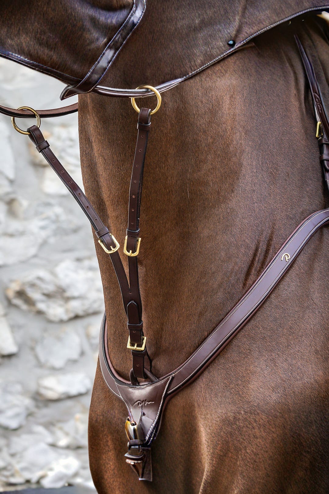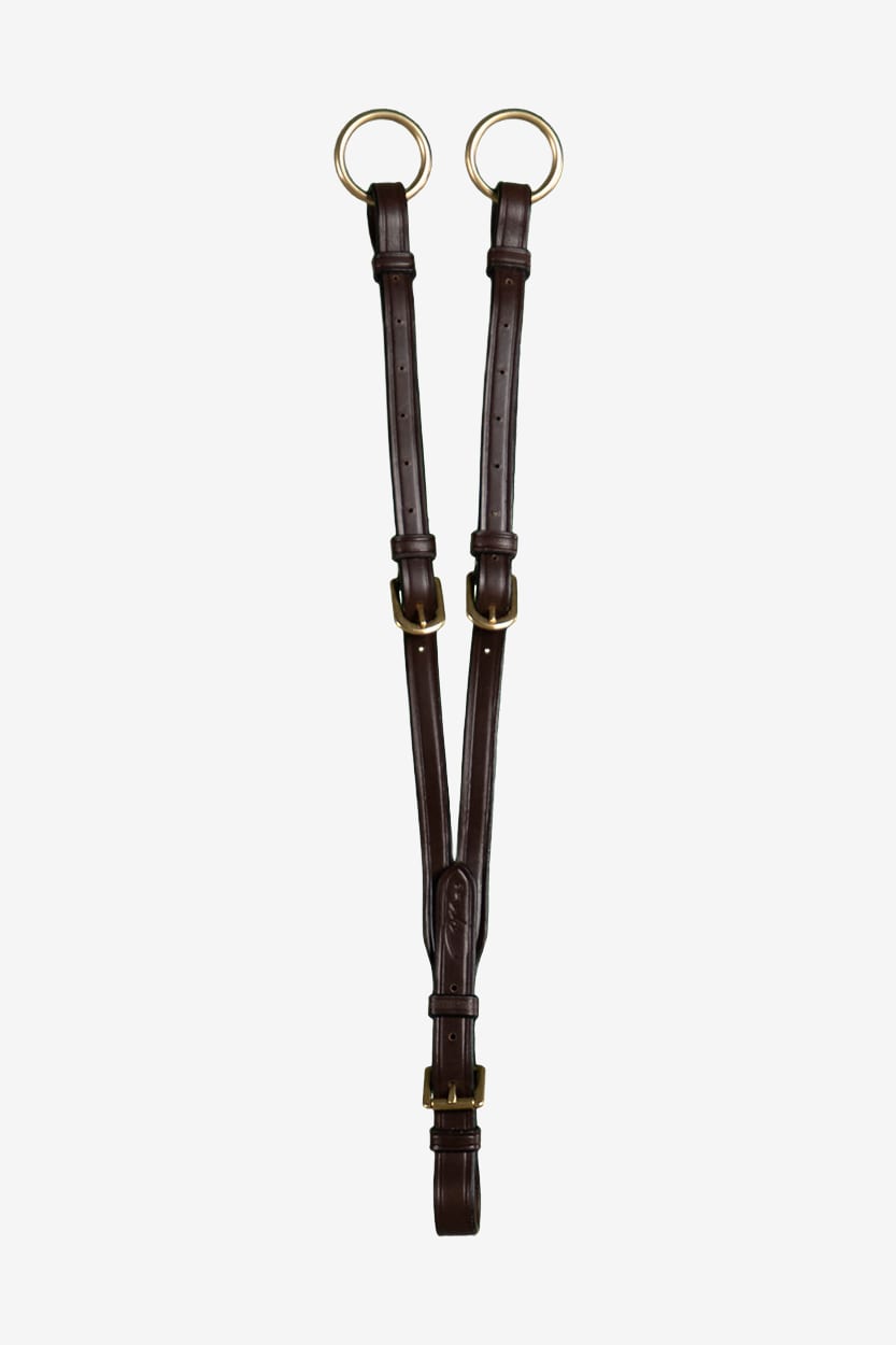 Luźna martingale z kolekcji Dyón wykonana z miękkiej europejskiej skóry premium, łatwo mocowana do napierśnika lub yoke (napierśnik typu yoke z centralnym paskiem), aby zapobiec zbyt wysokiemu unoszeniu głowy przez konia.