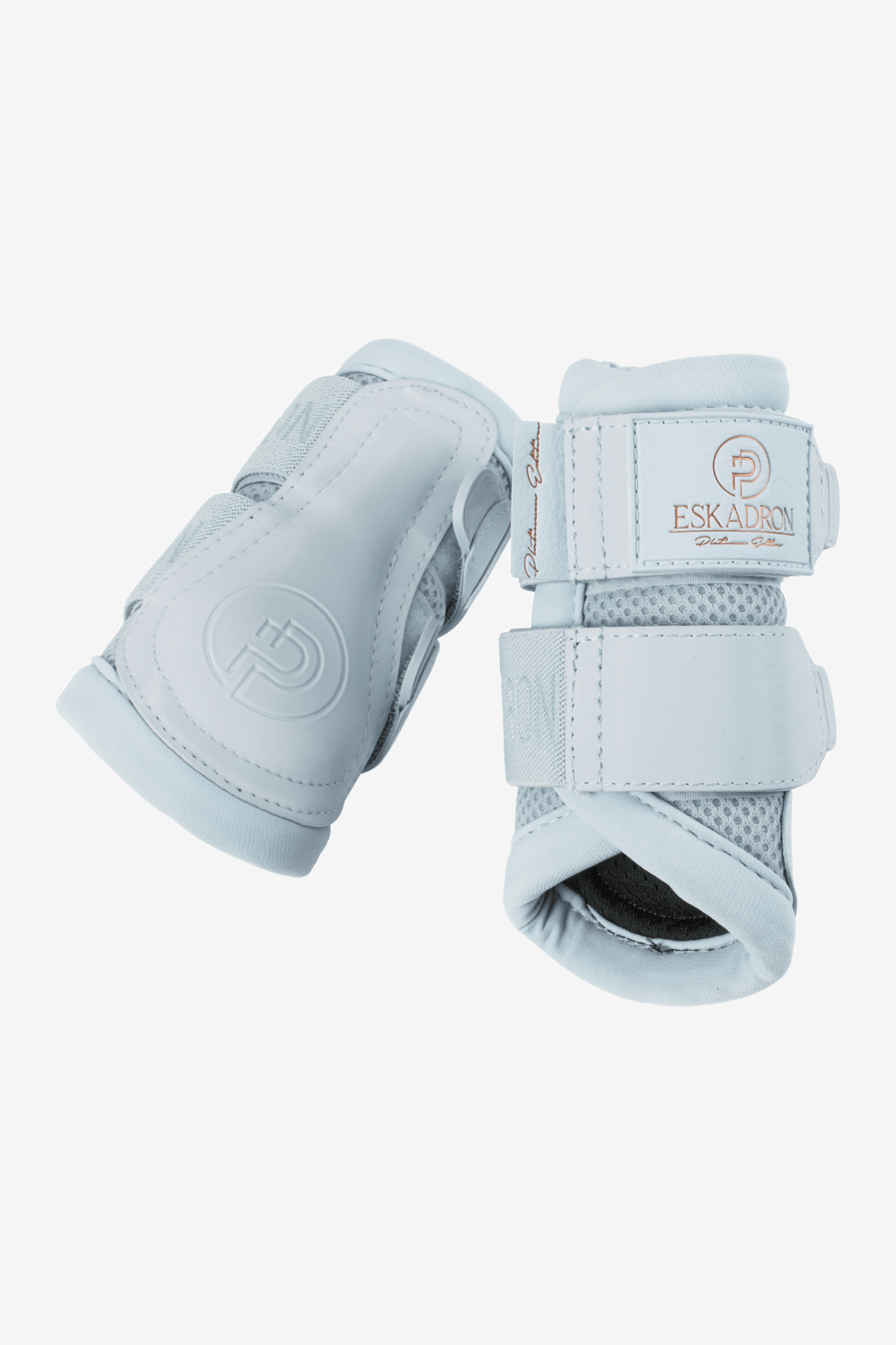Ochraniacze dla najmniejszych koni. Wyposażone w siateczkę zwiększającą wentylację. Zapinane na dwa rzepy. Złote detale. Ochraniacze oczywiście pasują do pozostałych produktów z kolekcji Eskadron Platinum 23.