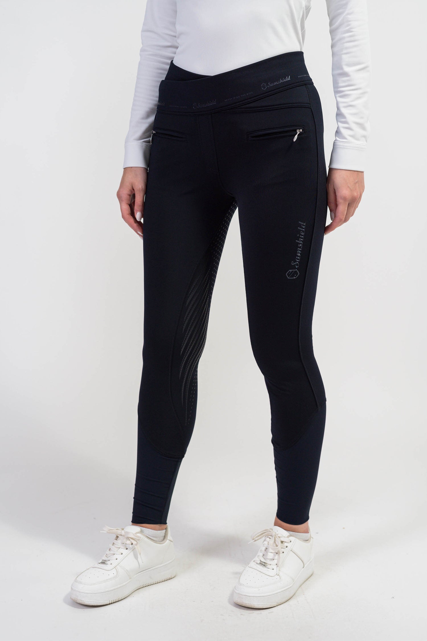 Zimowe bryczesy jeździeckie z miękkim, szczotkowanym wnętrzem z cienkiego polaru. Bryczesy w modelu pull-on z stylowym pasem, który zachodzi z przodu i posiada logo dookoła. Pełny lej z silikonowym nadrukiem zapewnia lepszą przyczepność w siodle. Dwie przednie kieszenie na zamek oraz kieszeń na telefon na lewym udzie. Na wysokości kieszeni na telefon znajduje się również słynne logo Samshield z dżetów wzdłuż uda. Elastyczny panel z tyłu zapewnia dobre dopasowanie. Elastyczne zakończenia nogawek zapewniają schludne i gładkie przejście w oficerkach.