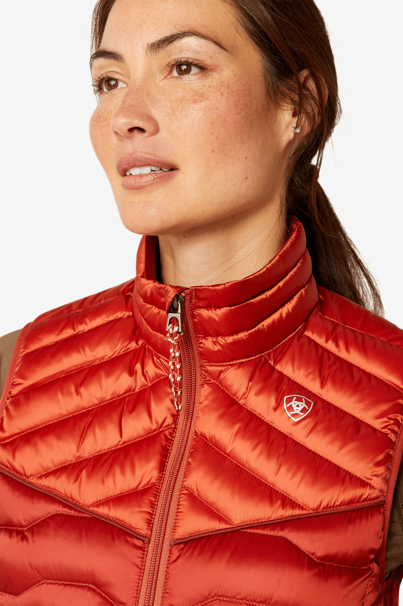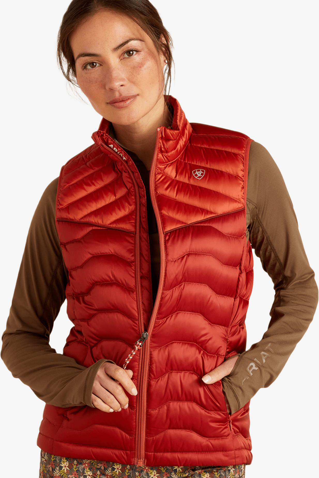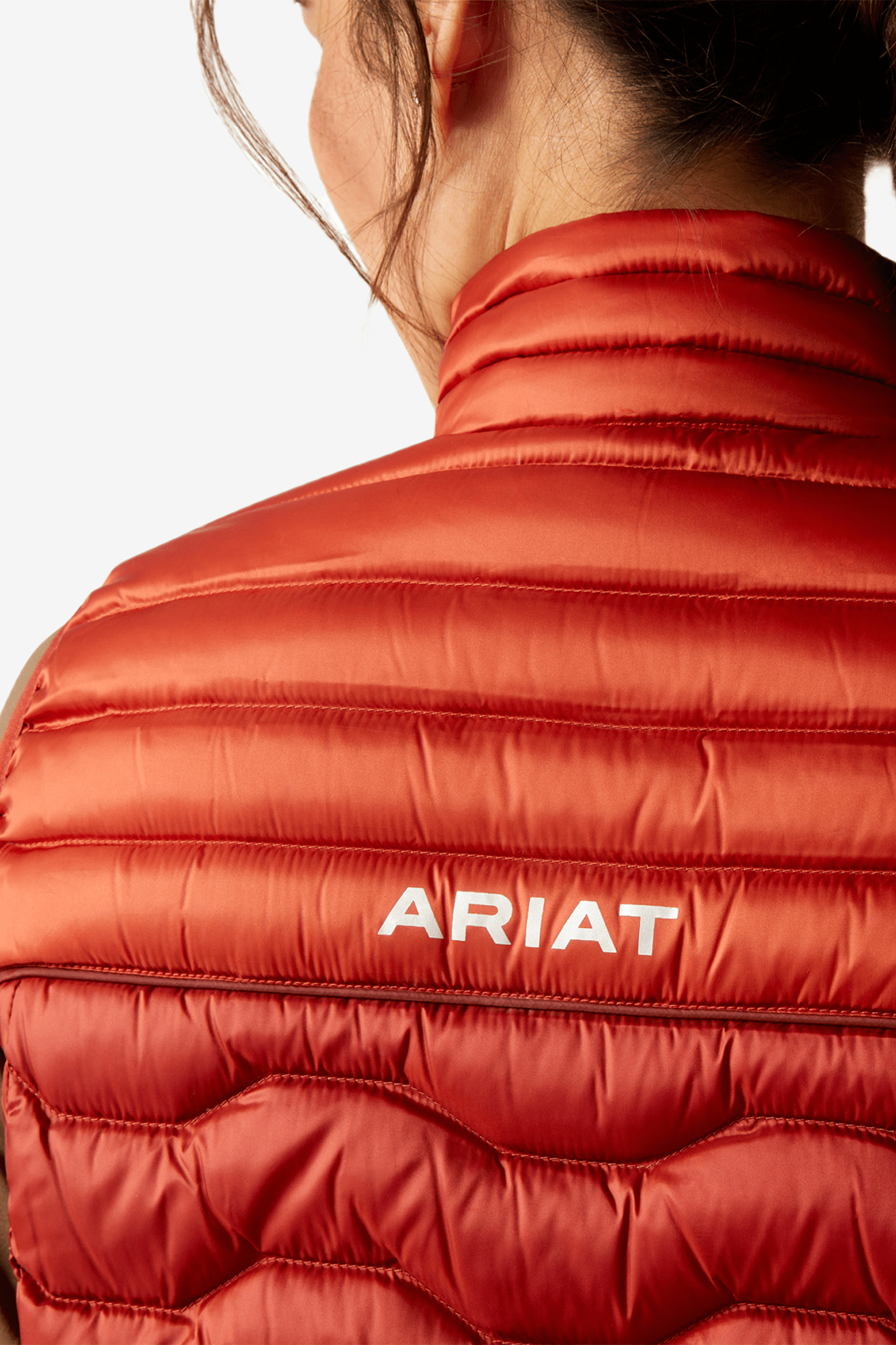 Stilvoll gestaltet mit einem auffälligen, gesteppten Look. Ariat-Logo auf der Brust, auf der linken Seite und auch am Rücken, wo das horizontale Steppmuster endet.
