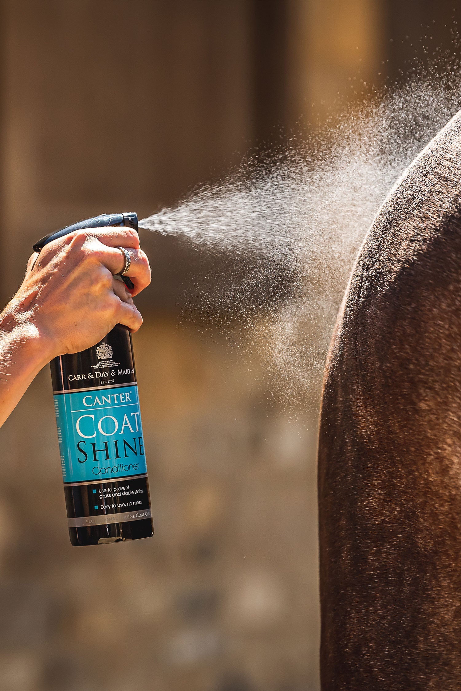 - Auf das Fell sprühen und ausbürsten, um ein gleichmäßiges Finish zu erzielen. Kann auf trockenem oder nassem Pferd verwendet werden. Beim ersten Mal an einer kleinen Stelle testen.