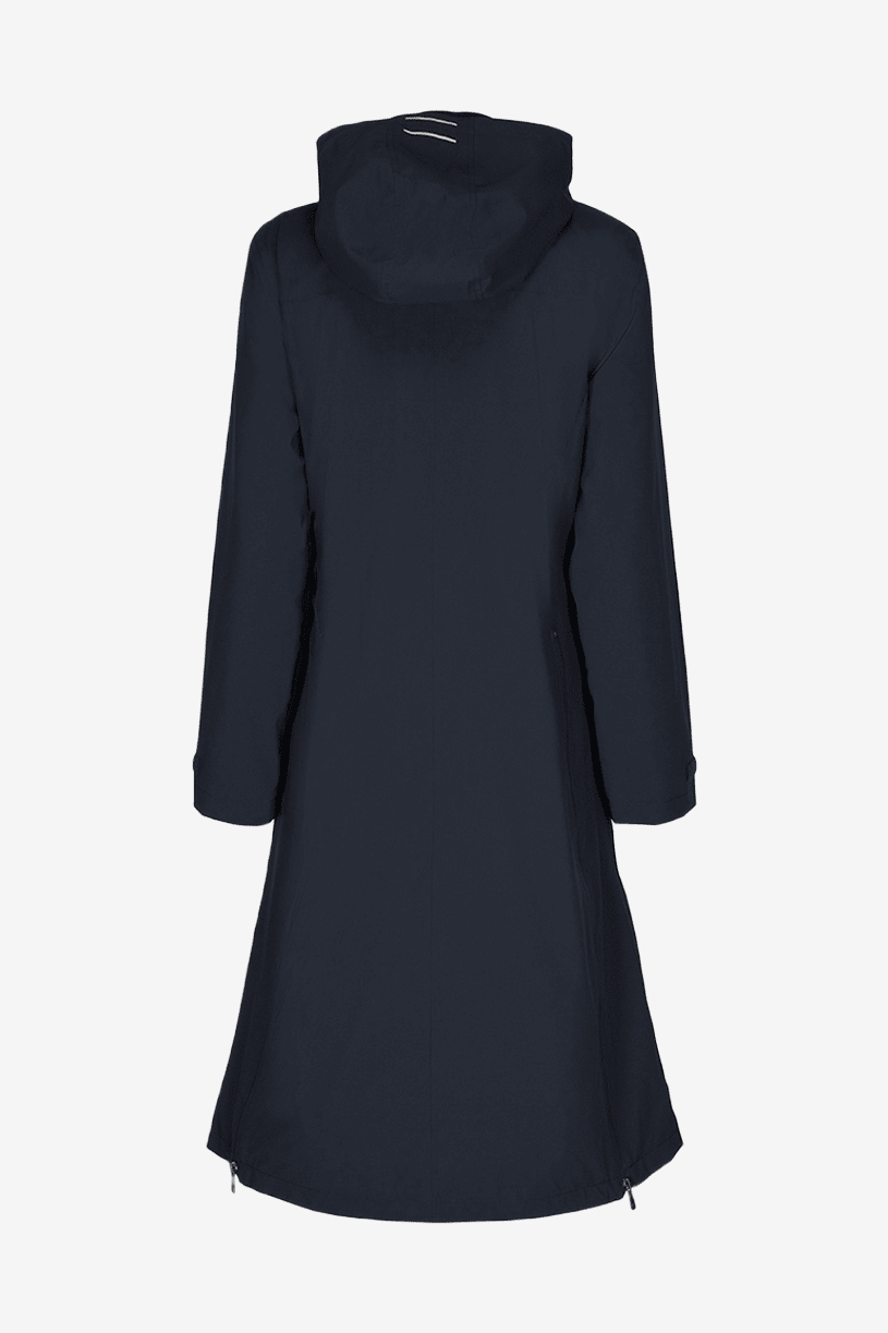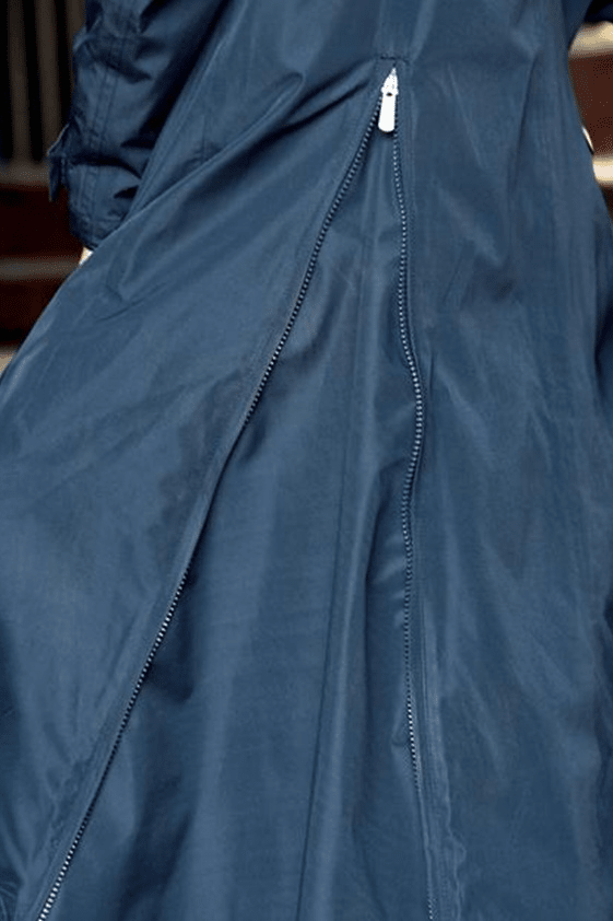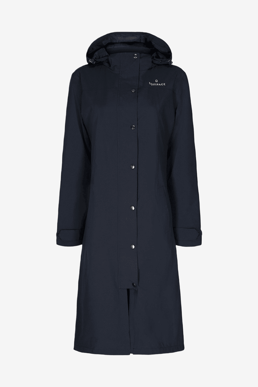 Langer, wasserdichter Regenmantel von Equipage mit Futter und größtenteils verschweißten Nähten. Der Stoff ist mit einer Folie laminiert und bietet eine Wassersäule von 3000MM. Zwei-Wege-Reißverschluss vorne und zwei Taschen. Weicher Stoff an der Innenseite des Kragens. Die Ärmelbündchen sind mit Klettverschluss verstellbar. Hinten befinden sich lange Reißverschlüsse, die beim Reiten geöffnet werden können, sodass der Mantel über den Sattel und den Pferderücken gelegt werden kann.