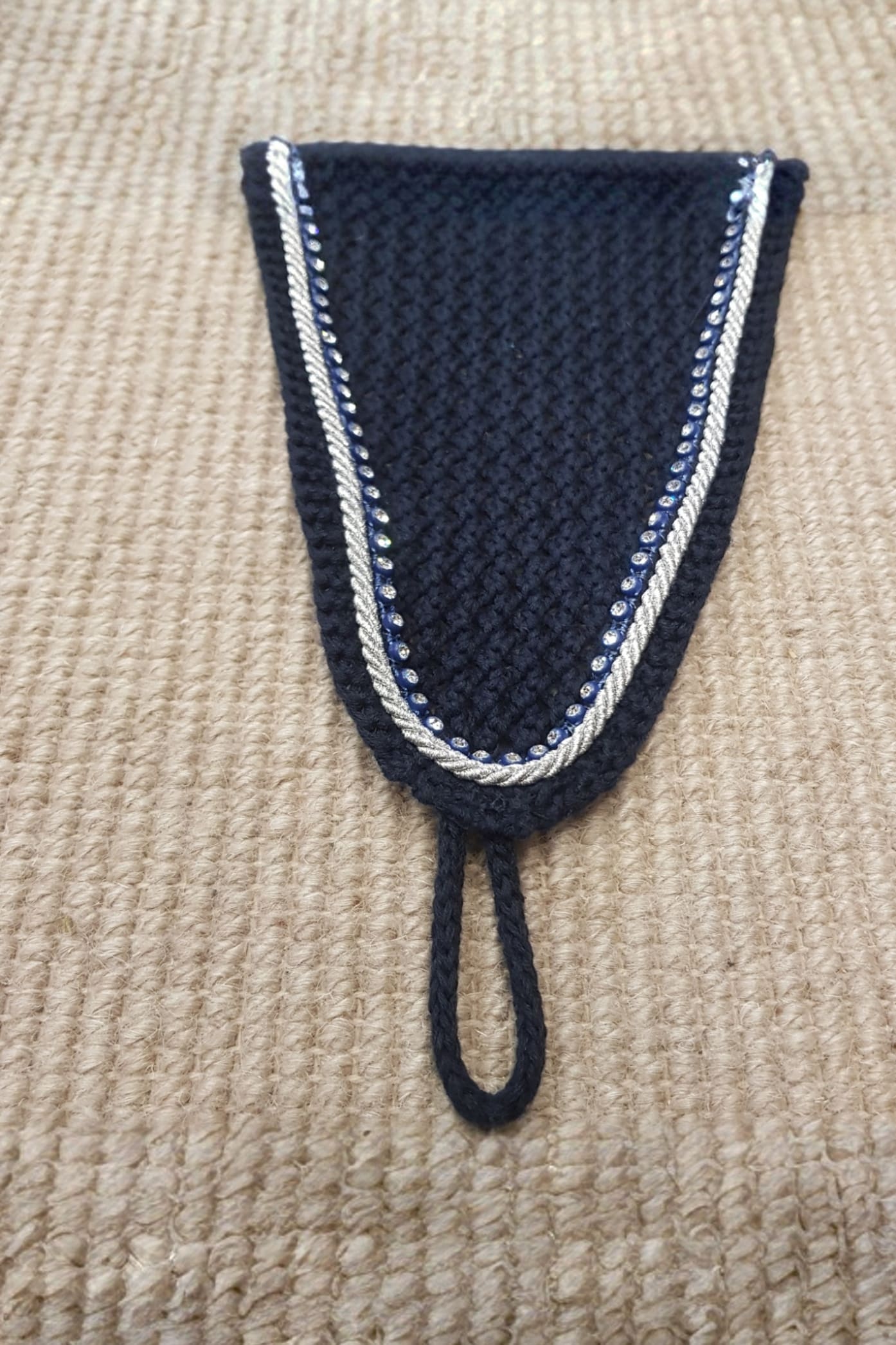 Gehäkelte Fliegenhaube im langen Modell mit zwei Kristall- und Silberkordeln entlang des Randes. Schlaufe am unteren Ende zur Befestigung am Nasenriemen, um ein Hochrutschen der Haube zu verhindern. Elastische Ohren für erhöhten Komfort für das Pferd. Das Nackenteil ist mit einem GG-Logo aus Silikon ausgestattet, das hilft, die Fliegenhaube an Ort und Stelle zu halten, ohne dass sie nach vorne über die Ohren rutscht.